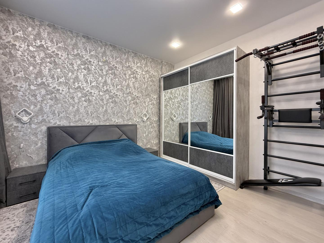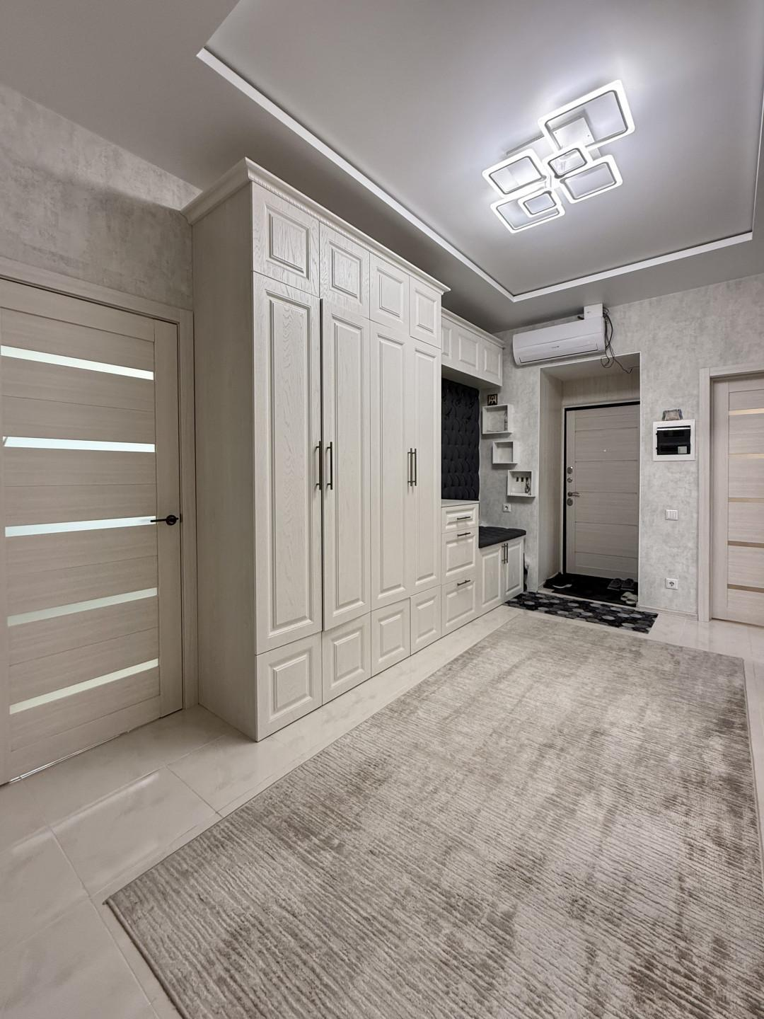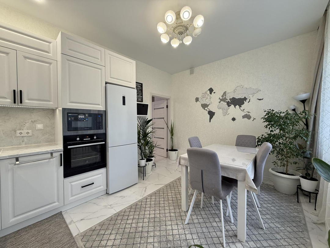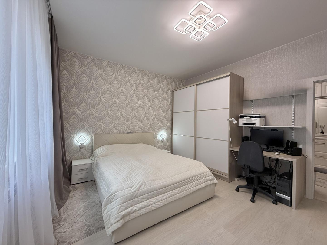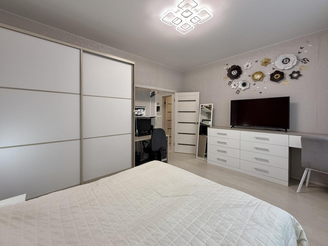 Качество ремонта вызывает восхищение. Выполненный евроремонт продуман до мелочей: установлены пластиковые окна, натяжные потолки, обновленная электрика и выровненные стены, оклеенные дорогими обоями. Санузлы отделаны современным кафелем, а на полу в комнатах и кухне уложен качественный ламинат, в коридоре – керамогранит. Лоджия застеклена и утеплена с панорамным остеклением, а межкомнатные двери и входная металлическая дверь выполнены на высоком уровне.