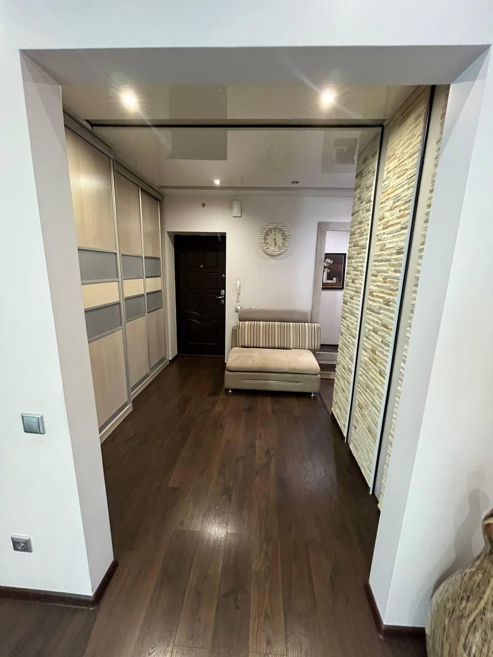 Квартира состоит из 3 комнат площадью 16.5, 6.5 м² и кухни столовой 54 м². Имеется просторный коридор (20.7 м²), вместительная гардеробная, огромная застекленная лоджия с ремонтом.
