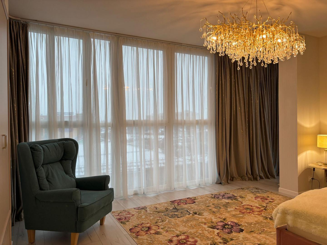 Шторы подвешены на электрокарнизы.