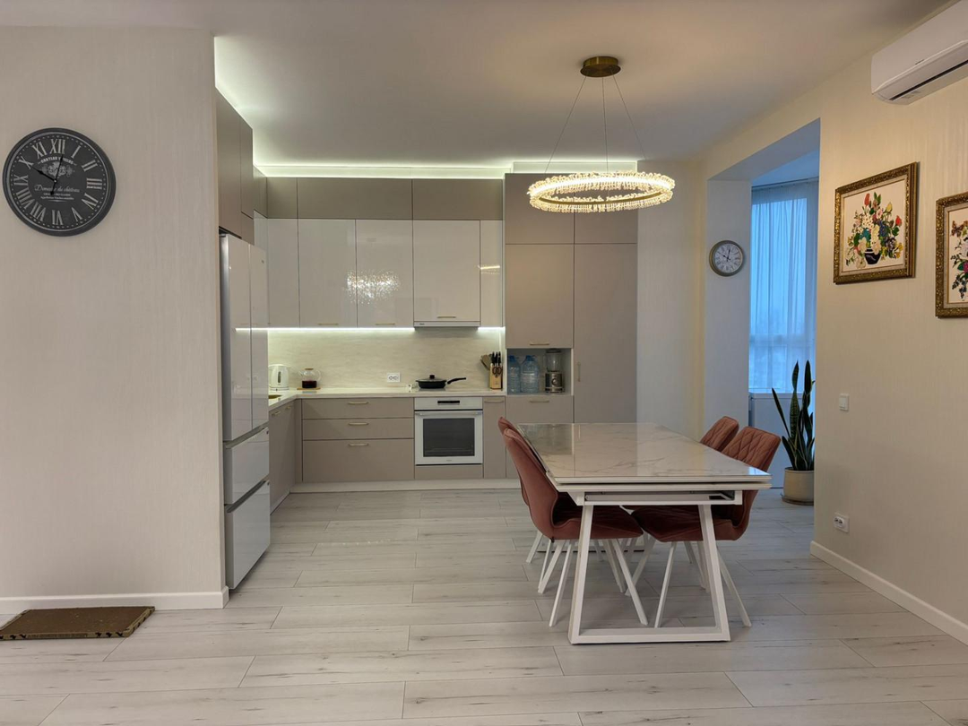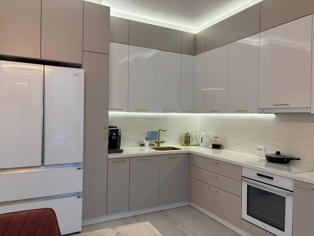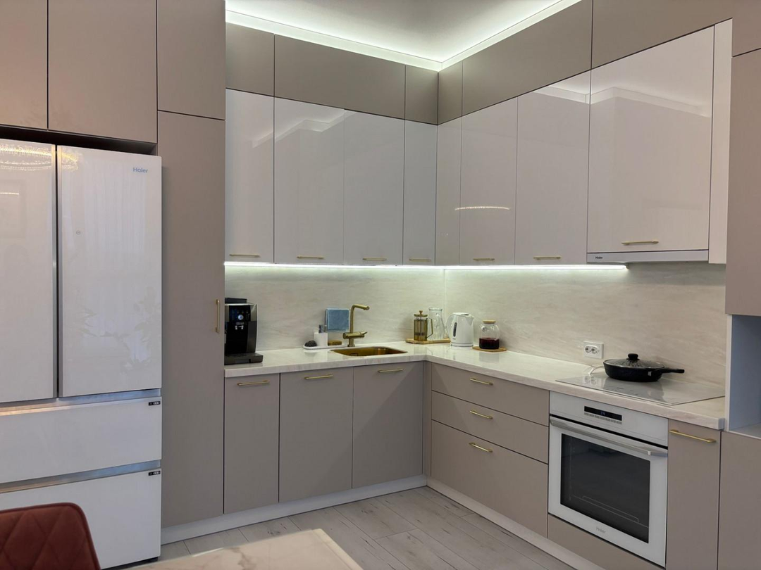 Кухня оснащена немецкой техникой Haier: электрический духовой шкаф и варочная поверхность. Встроена вытяжка. ВНИМАНИЕ! Вся кухонная техника остается Вам!