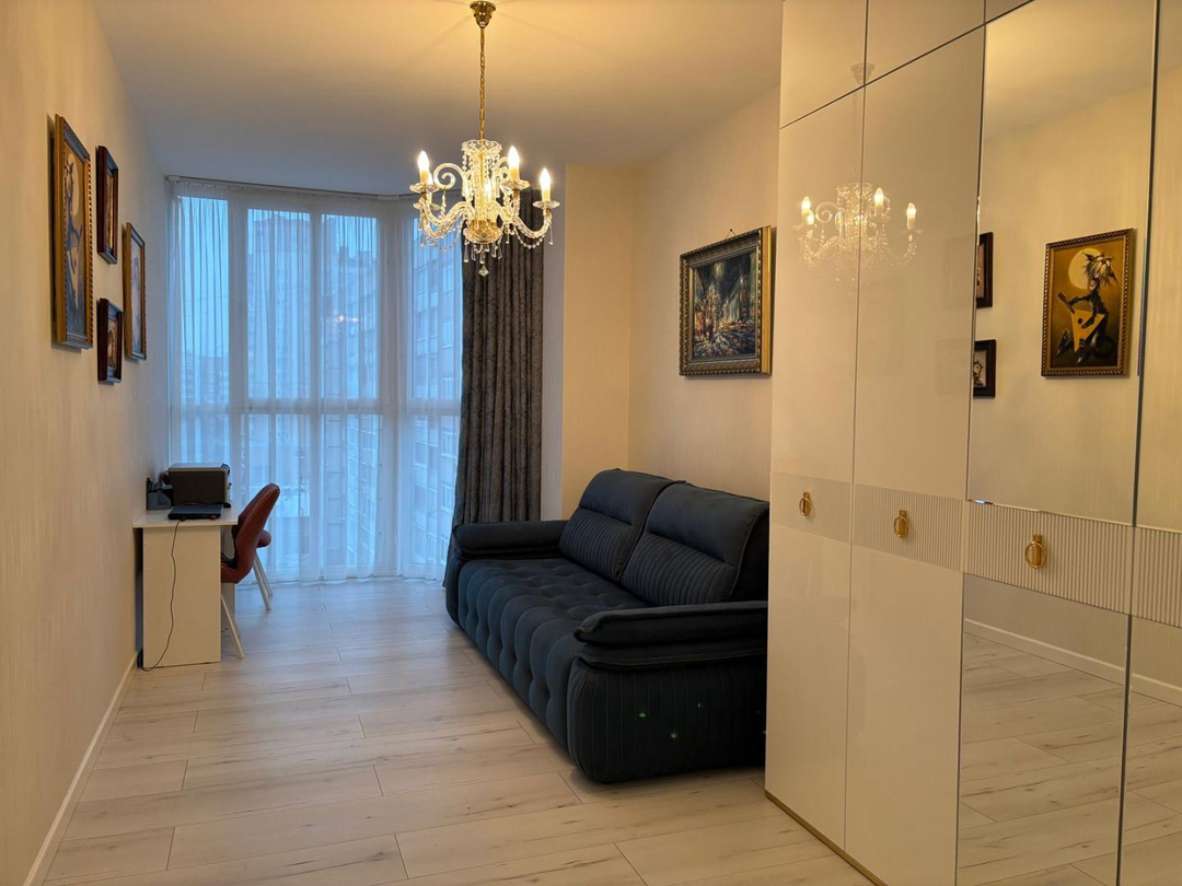 В квартире две просторные жилые комнаты - уютная, очень светлая и просторная спальная комната (42 кв.м) и кабинет, который возможно переоборудовать под детскую комнату (25 кв.м).