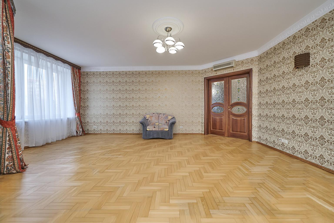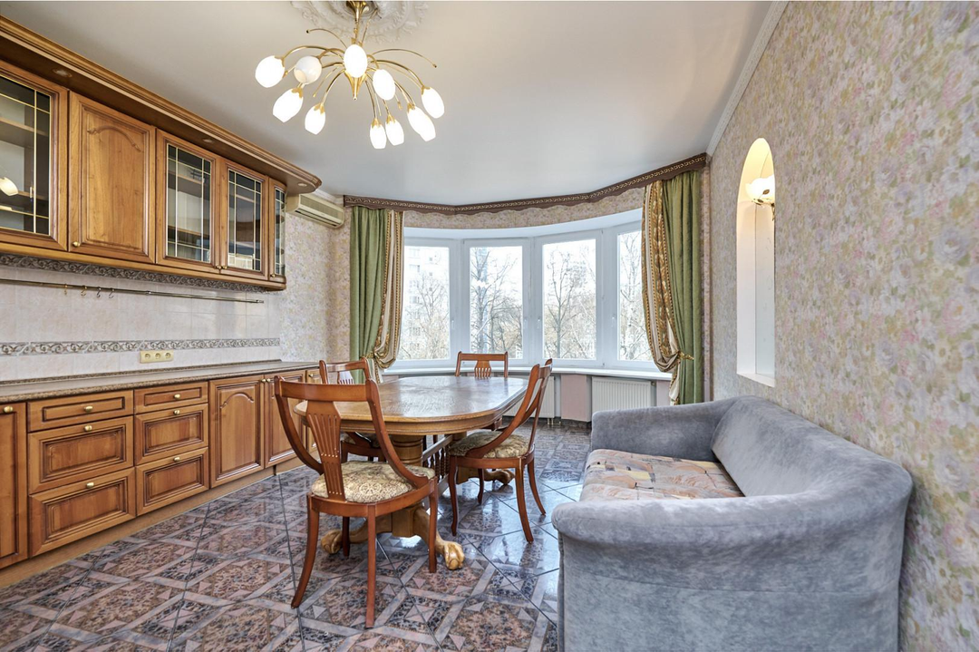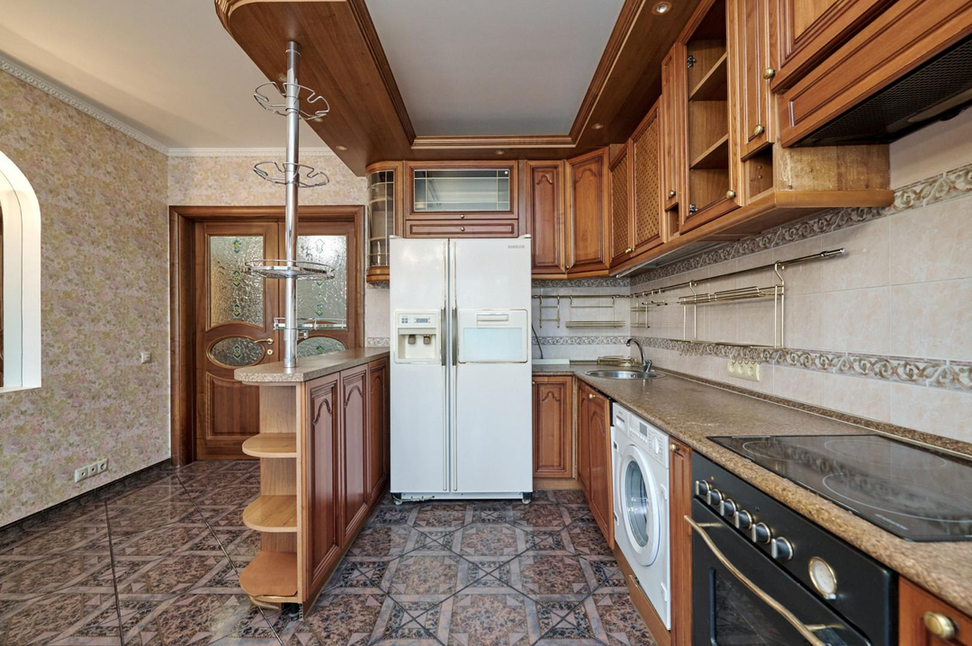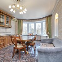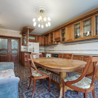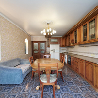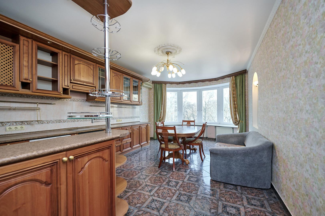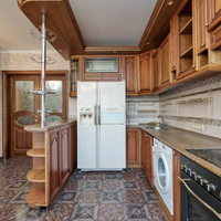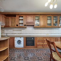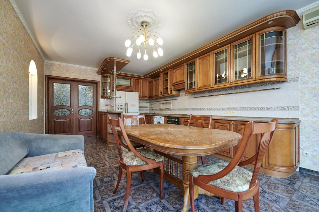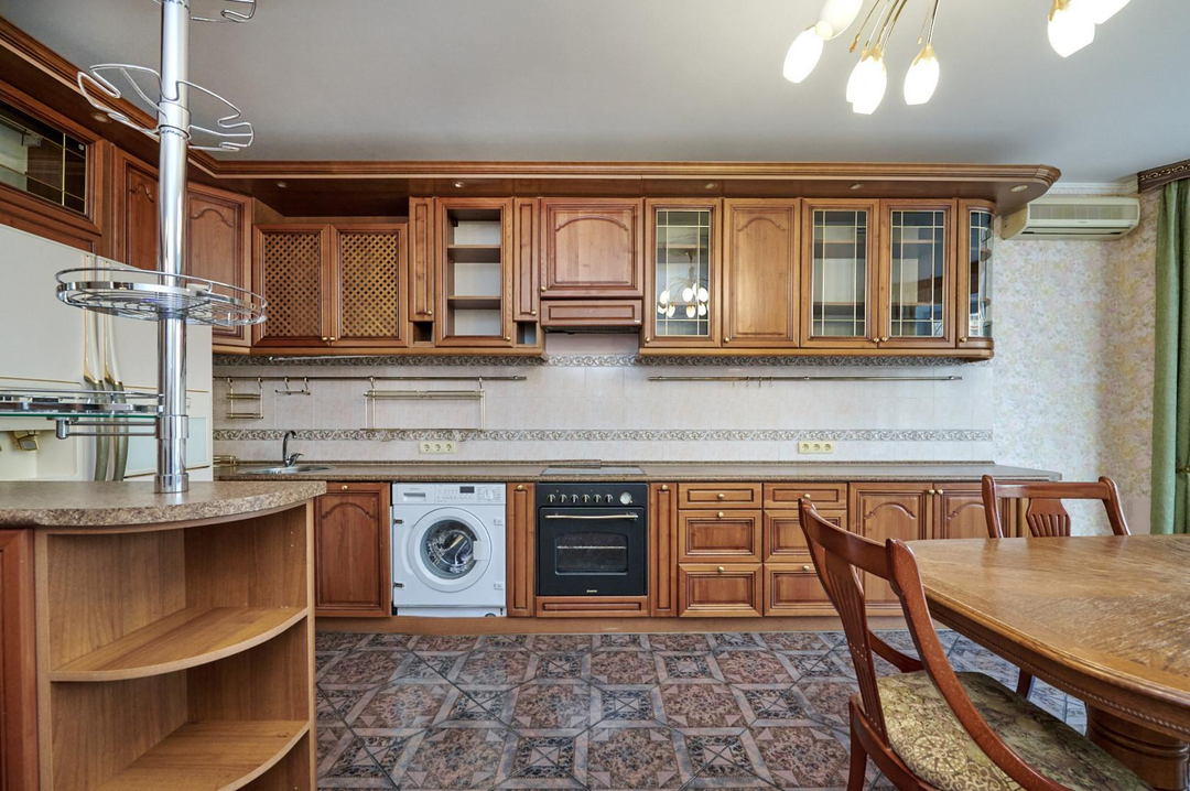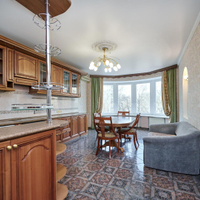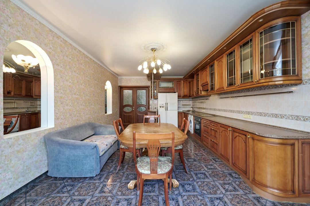 Кухня оборудована всей необходимой бытовой техникой, частично мебелью, теплыми полами и кондиционерами премиального качества. На полу выложен паркет.