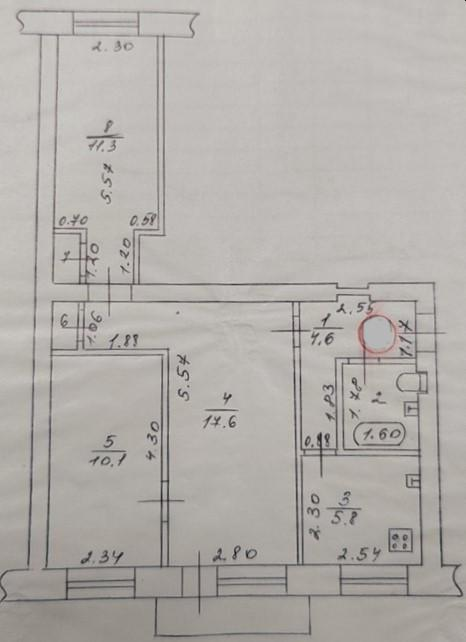 - Общая площадь квартиры - 53,7кв.м., жилая - 39 ( 17,6 + 11,3 + 10,1 )кв.м., кухня - 5,8кв.м, 2 вместительные кладовки.