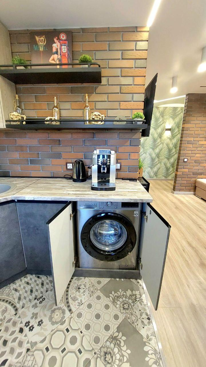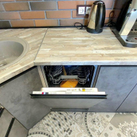 При продаже в квартире остается кухонный гарнитур, кухонный стол, выполненный на заказ, и барные стулья, духовой шкаф, варочная панель, вытяжка, стиральная машинка, посудомоечная машинка, 3 кондиционера, водонагреватель.
