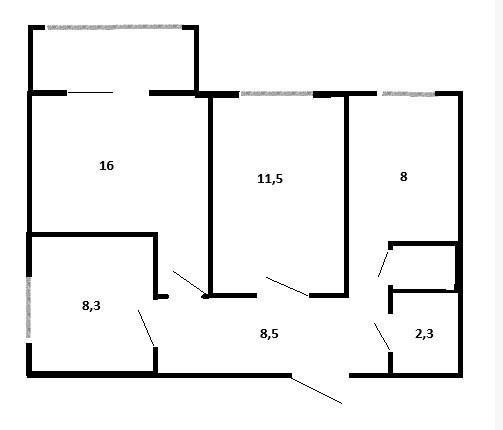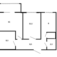 Кухня 8 м2, Комнаты: 16 м2; 11,5 м2; 8,3 м2, прихожая 8,5 м2.