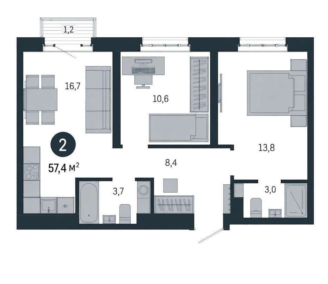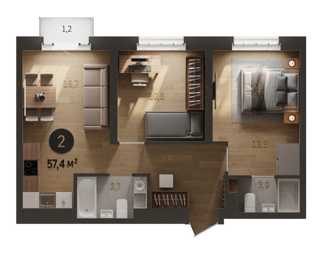 Евро 3 - с двумя санузлами, мастер спальней, кухней-гостинной и балконом