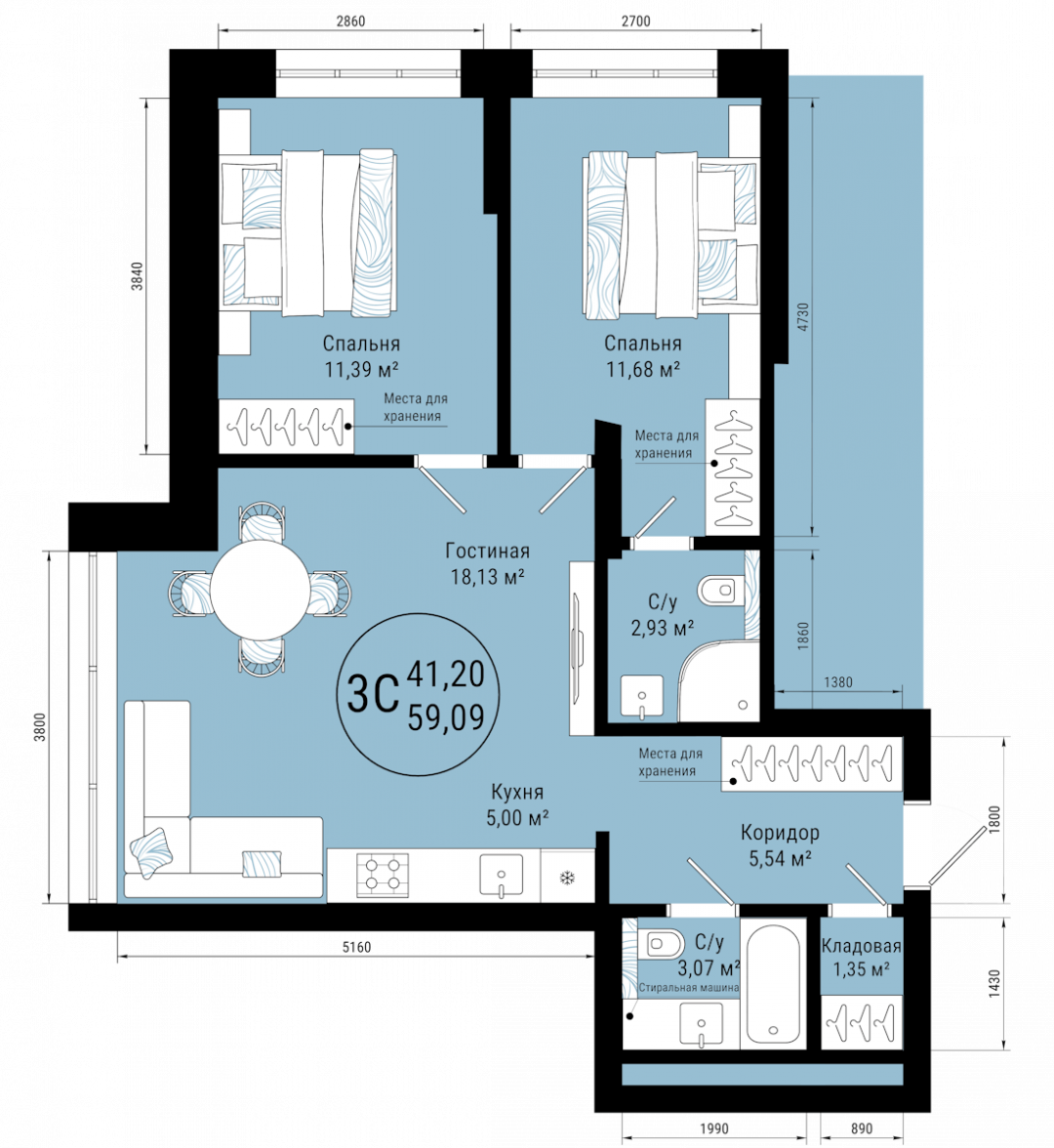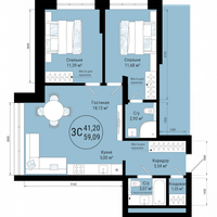 Общая площадь 59,0 м2. Удобная планировка с просторной кухней-гостинной 23,1кв.м. и 2 спальнями 11,39кв.м. и 11,68к.в.м.(1 мастер-спальня со своим санузлом 3кв.м.)