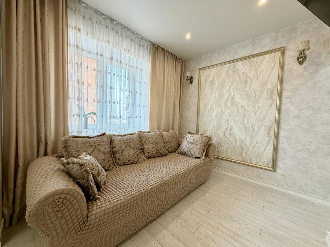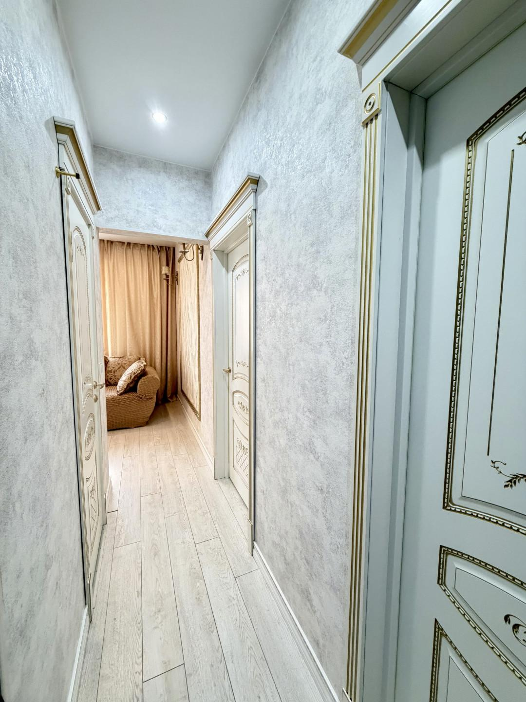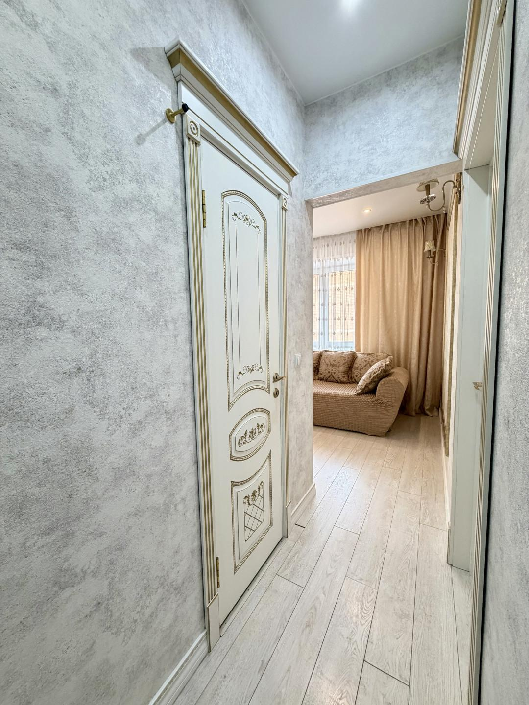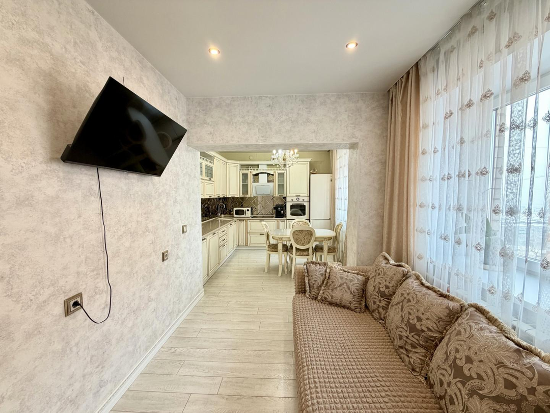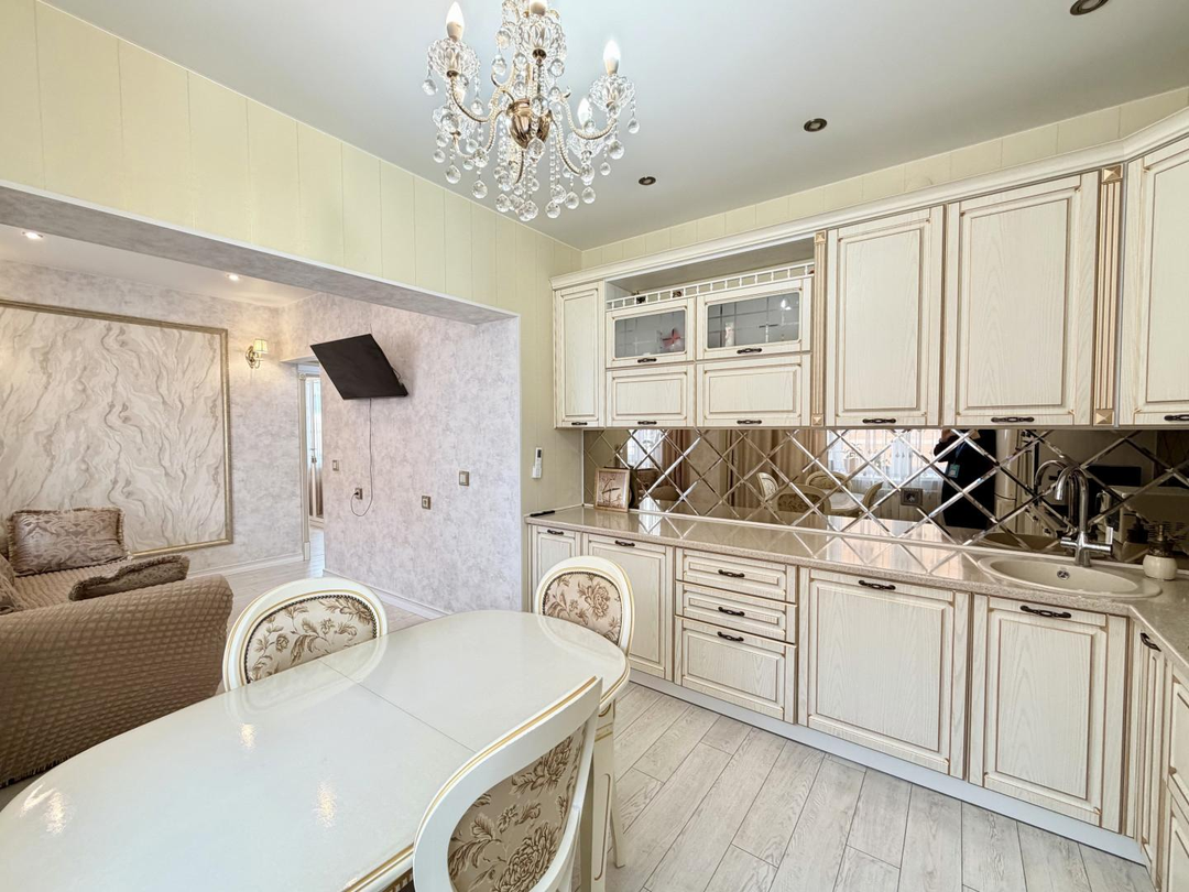 О Квартире:Идеальный вариант для большой семьи!Отличная планировка, все комнаты изолированы! В кухне-гостиной 19,5 м2 вы будете принимать гостей, а детки будут спокойно спать!Квартира солнечная, просторная, светлая. Окна выходят на обе стороны!В квартире сделан хороший и качественный ремонт, все выполнено в мягкой цветовой гамме, двери и арки из дерева инкрустированы золотом, натяжные потолки, пластиковые окна, 2 раздельных санузла облицованы кафелем, с новой сантехникой.Подъезд очень чистый, соседи все тихие, порядочные!Дополнительные блага-кондиционер и водонагреватель.ВСЯ МЕБЕЛЬ И ТЕХНИКА ОСТАЕТСЯ В КВАРТИРЕ, ЗАЕЗЖАЙ И ЖИВИ!