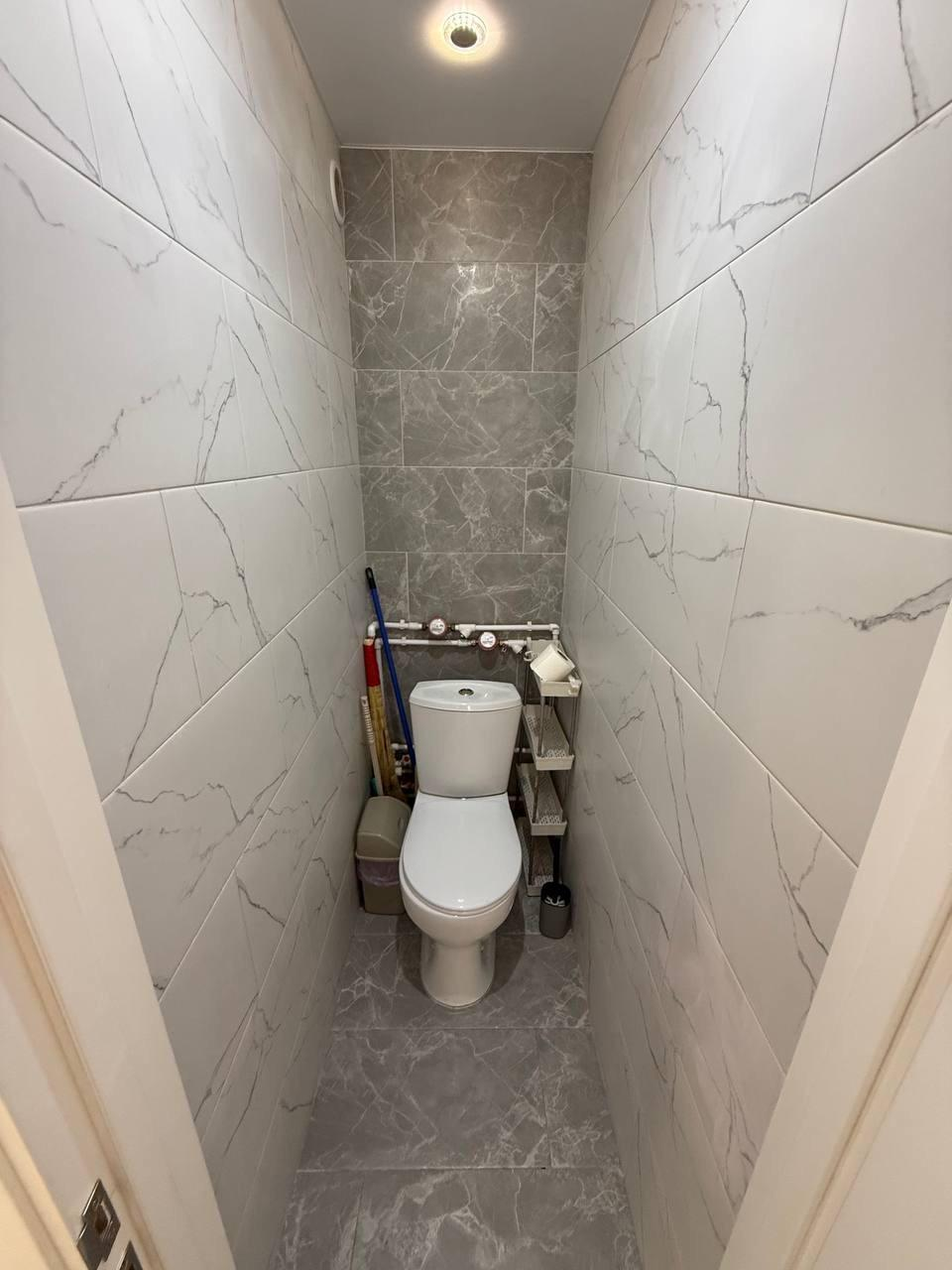 Раздельный санузел, облицованный качественной плиткой.