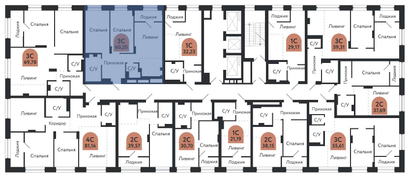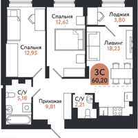 Общая площадь квартиры – 60,2 кв. м. Лоджия не входит в общую площадь.
