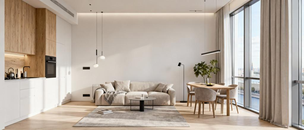 - Большая кухня-гостиная с угловым панорамным остеклением