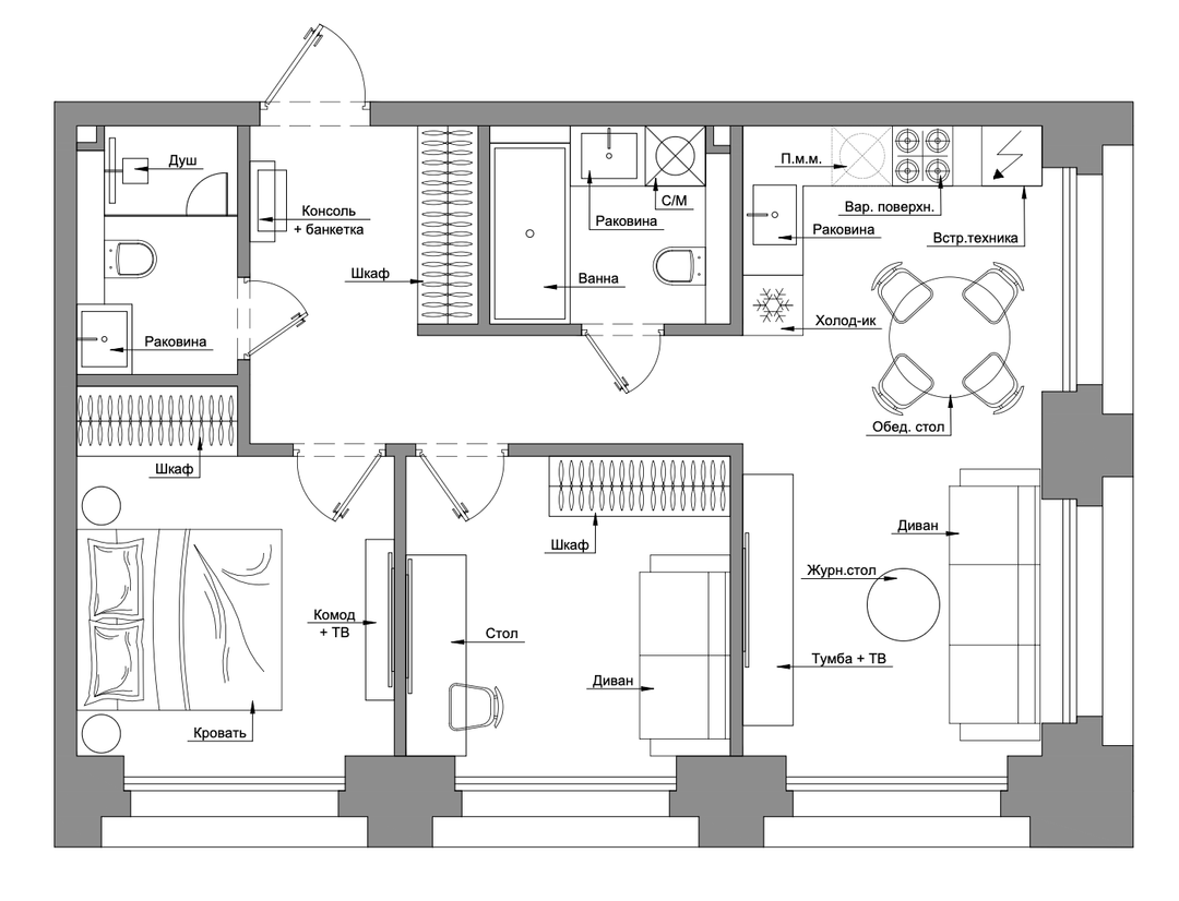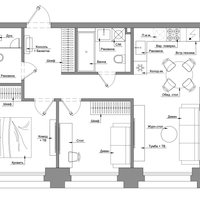 Планировка (на картинках сгенерирован вариант мебелеровки + подготовлено предварительное планировочное решение с расстановкой мебели и оборудования):