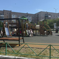Во дворе новая игровая плащадка, асфальтированная парковка.