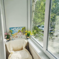 Балкон застеклен пластиковыми окнами, обшит, утеплен, имеются удобные вместительные полки для хранения.