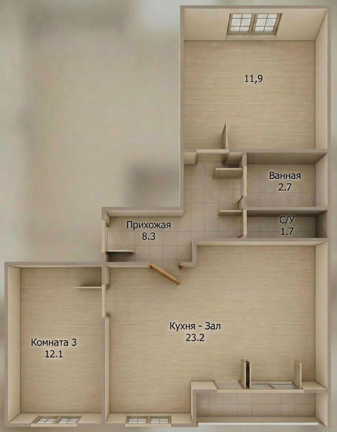 Площадь 60 кв.м., продуманная планировка «распашонка» — окна выходят на разные стороны, поэтому в квартире всегда много света и легко проветривать. Формат 3-евро: просторная кухня-гостиная и две изолированные комнаты — удобно для семьи с детьми.