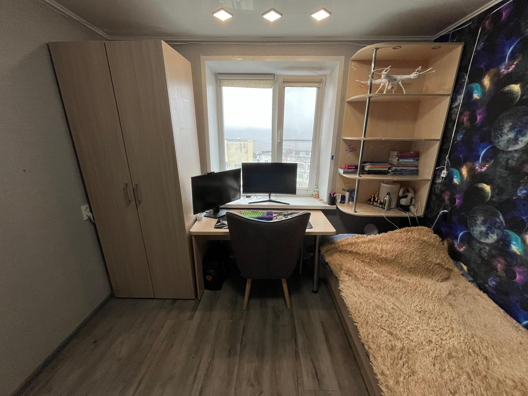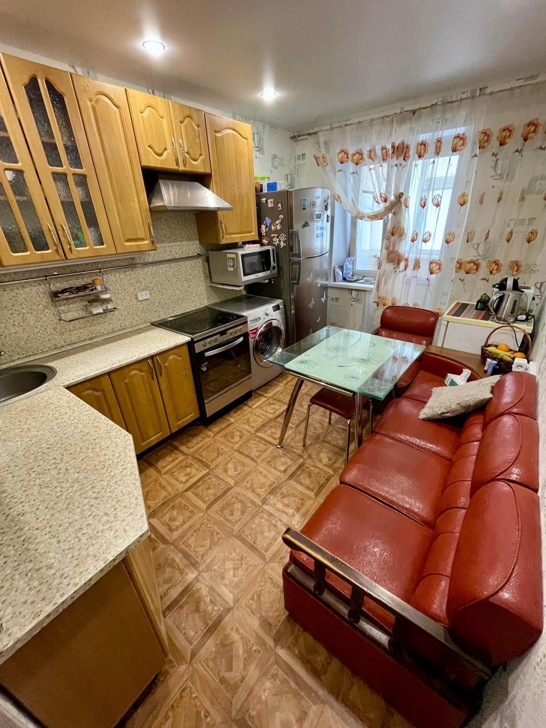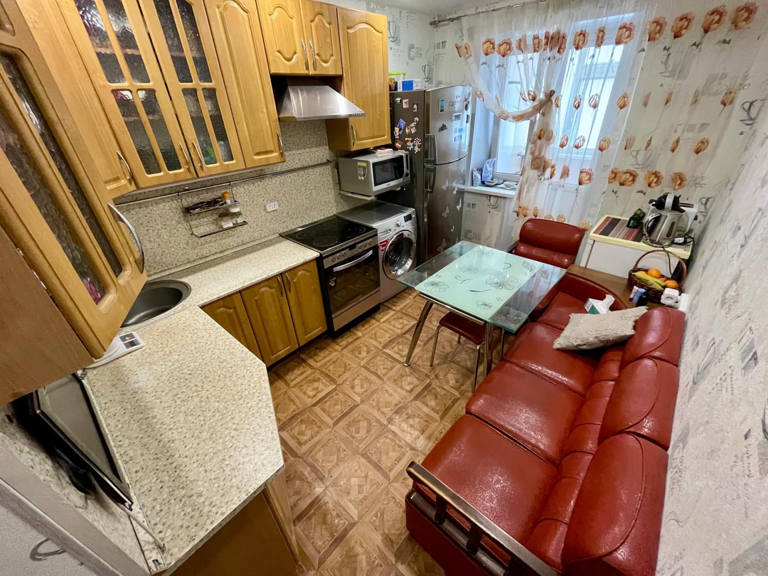 Кухня 9 м² - мечта любой хозяйки, здесь поместится вся Ваша семья. Хороший встроенный кухонный гарнитур, вся необходимая техника (электрическая плита, холодильник, микроволновая печь), обеденная зона останутся новым хозяевам!