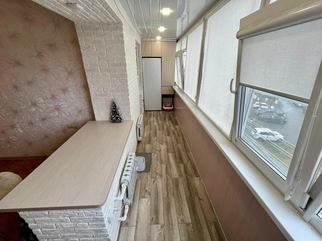 Кухню и зал соединяет просторная лоджия с удобной системой хранения.