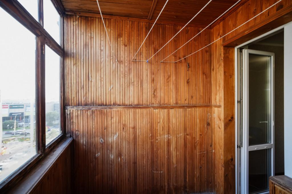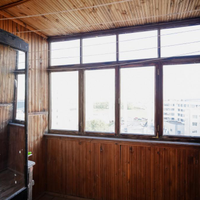 Пластиковые окна. Лоджия - просторная, застеклена и обшита деревянными панелями.