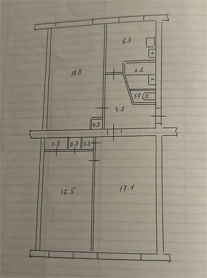 Основные характеристики:Общая площадь: 62,6 м².Кухня: 6,3 м².Прихожая: 4,9 м².Комнаты: 17,1 м², 16,8 м², 12,5 м².Год постройки: 1973.Капитальный ремонт: 2025 год.Санузел раздельный.Ремонт косметический.