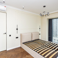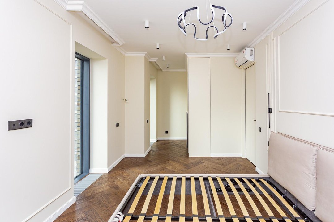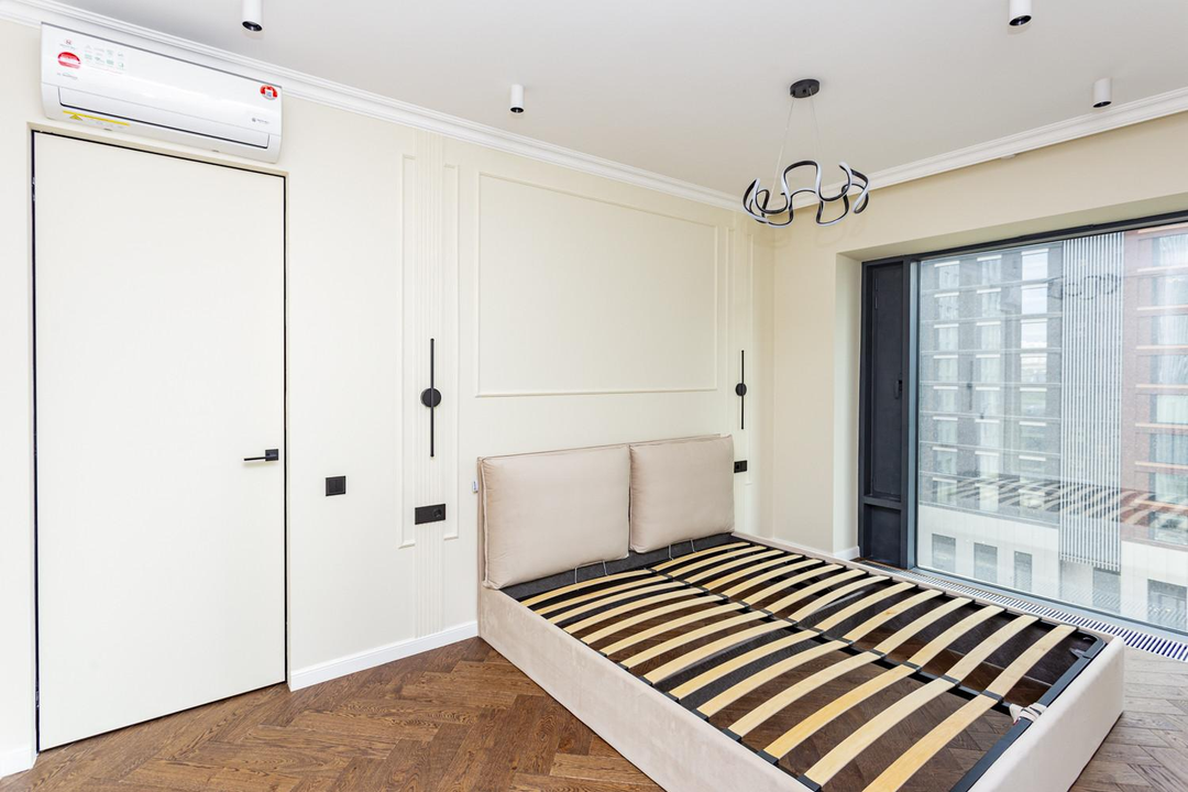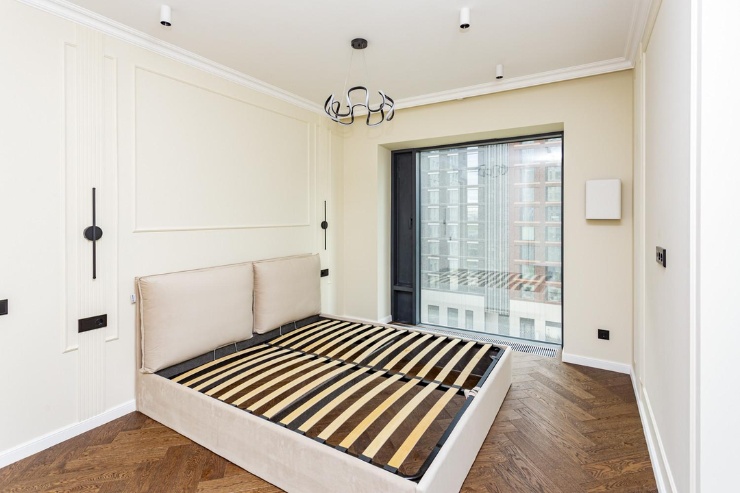*Спальня (18,7 кв.м) имеет три панорамных окна с видом на реку и внутренний двор, уже с отделкой, полы дерево,есть кровать и встроенный шкаф для хранения вещей, готовые карнизы для штор и светильники, розетки;