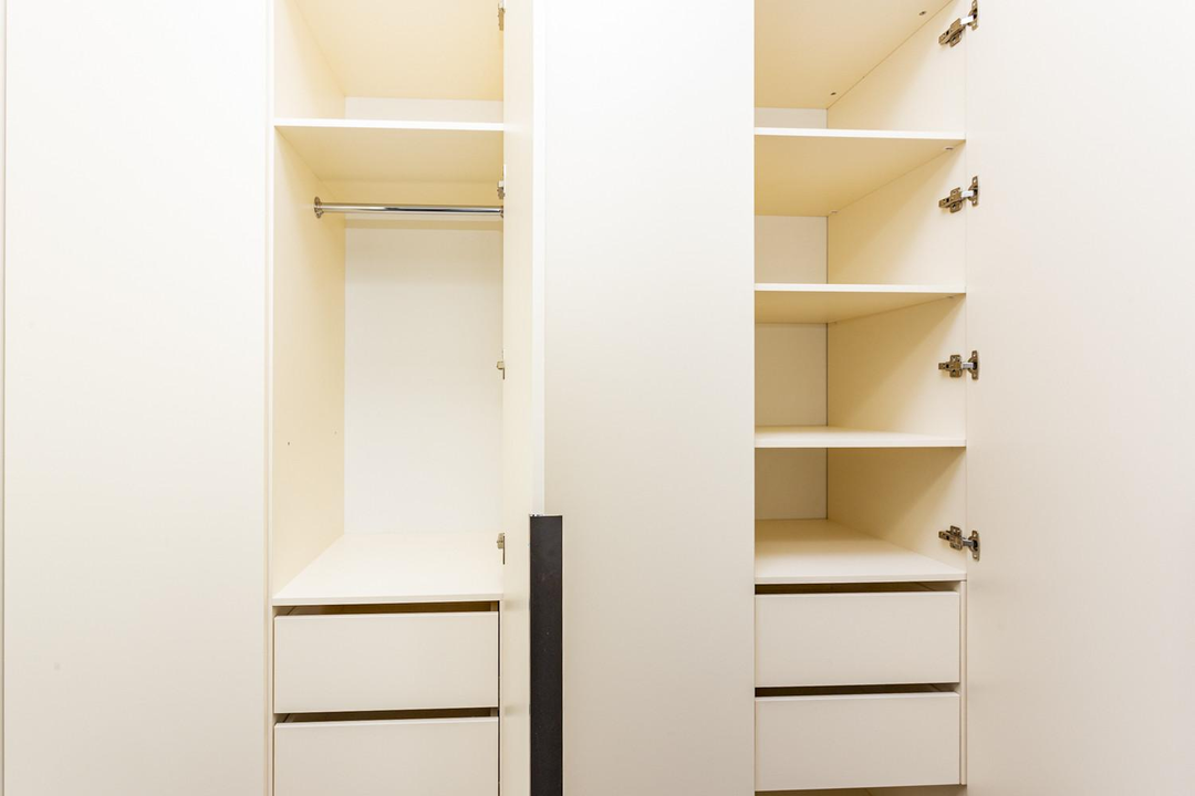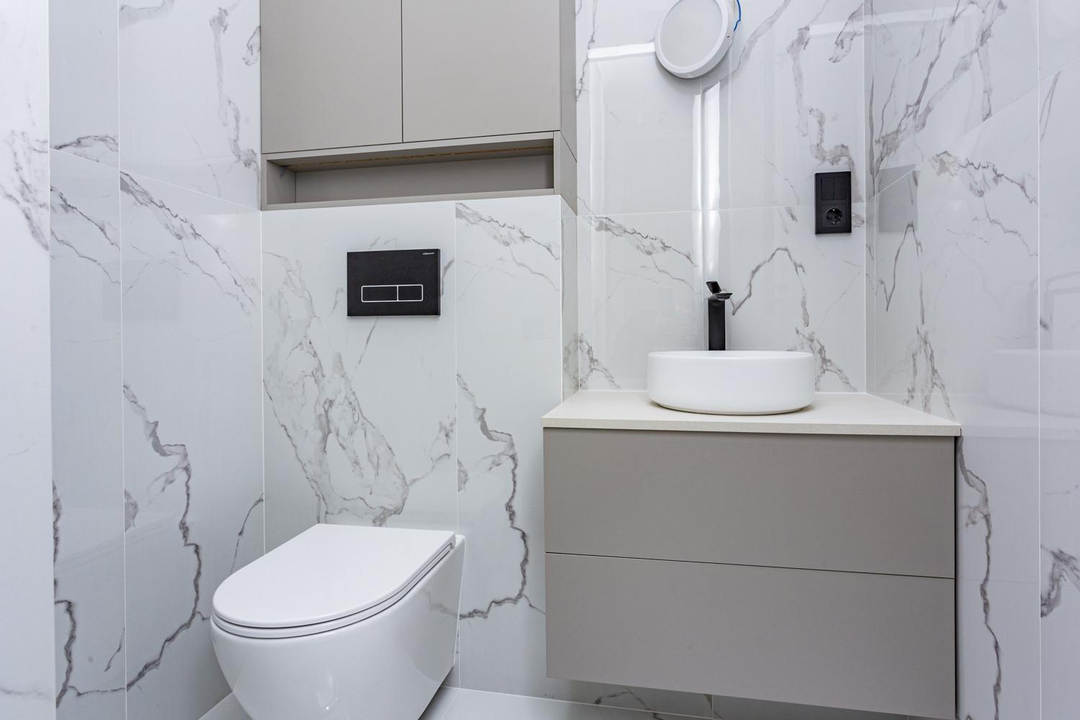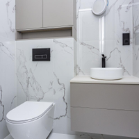 *Гостевой санузел (4 кв.м) отделка керамогранит и полы с подогревом, при входе с двух сторон расположены: встроенный шкаф для стиральной и сушильной машины и 2-ой встроенный шкаф для белья и одежды.