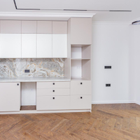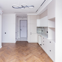 *Кухня гостиная (17.6 кв.м) -с дизайнерской отделкой , стены покрашены, пол дерево американский орех, кухонный гарнитур подготовлен для встроенной техники и карнизы для штор, светильники, розетки;