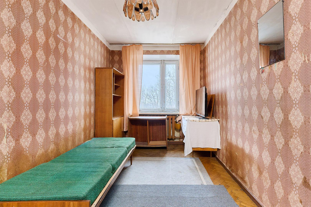 Квартира-распашонка: окна деревянные, открывают вид на тихий зелёный двор и на оживлённую улицу .