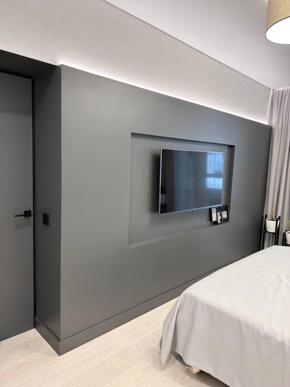 Установлен теневой потолок, дюрополимерный плинтус выкрашен в цвет стен.
