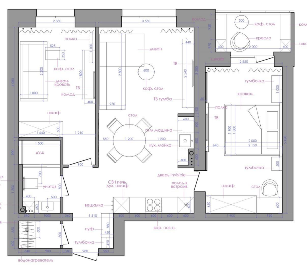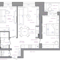 Во всей квартире разработана разнозоновая система освещения с применением световых спотов и лент,