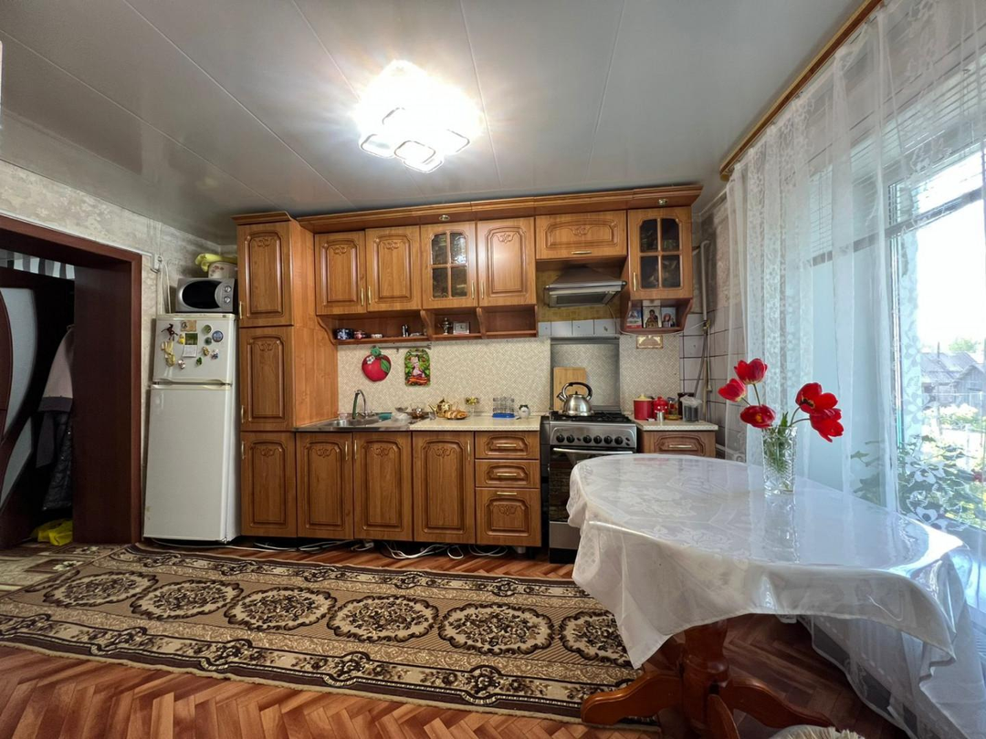 В доме:Окна ПВХКрыша покрыта металлочерепицыЧасть дома из бревна и пристройка из кирпичаВсе коммуникации: газ, двухконтурный котел, центральное водоснабжение, а также есть печка.