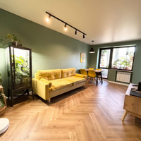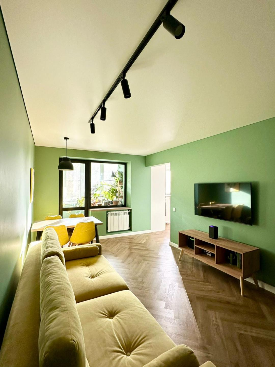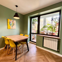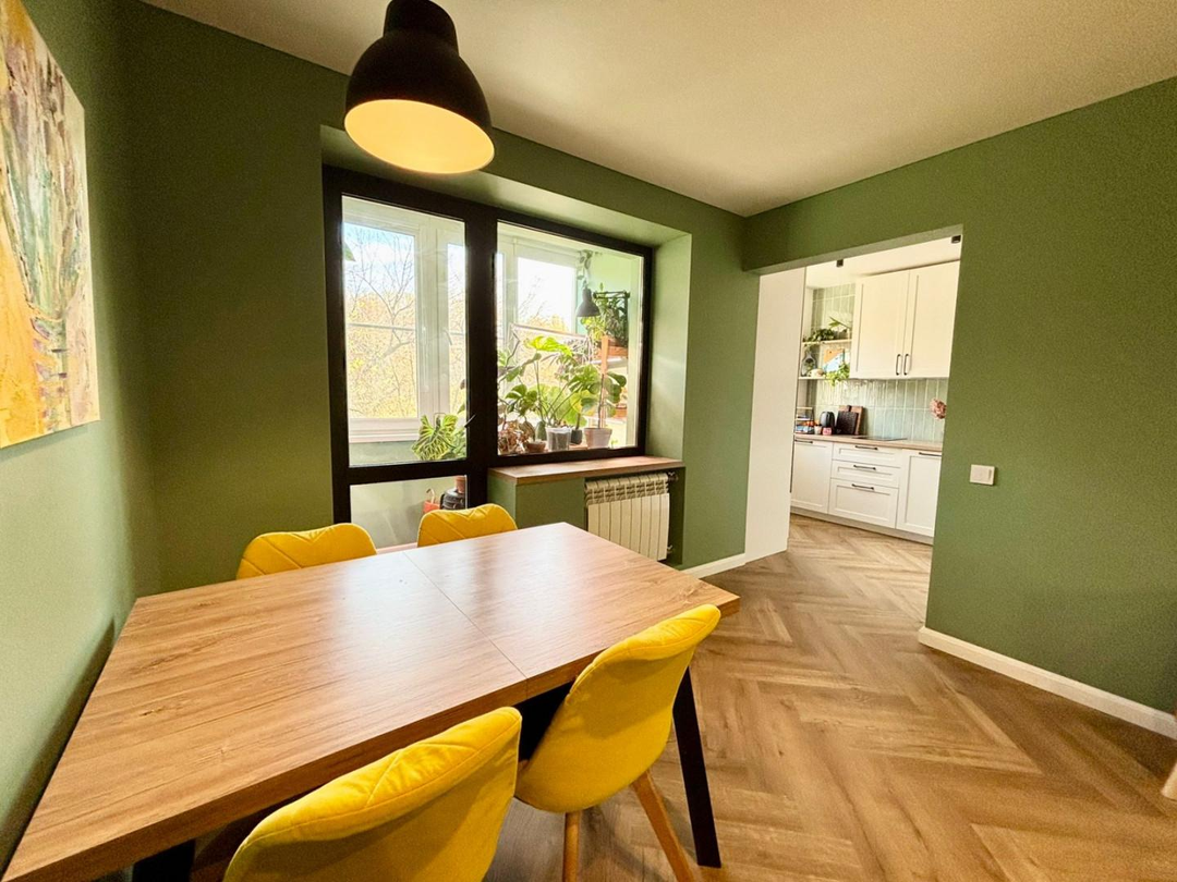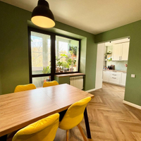 * Гостиная: Стильный ремонт 2022 года. Водостойкий кварцвинил, покраска стен, натяжной потолок с продуманной системой освещения (свет над диваном и обеденным столом). Подоконник - под дерево.