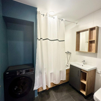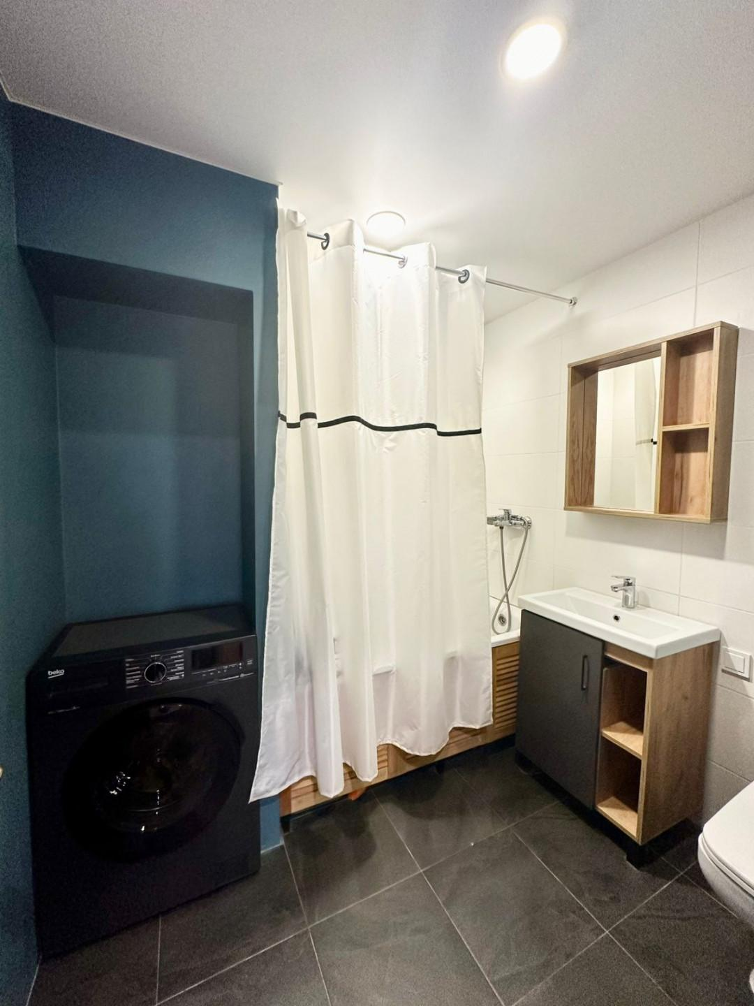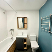 * Санузел (совмещенный): Вся сантехника заменена в 2020 году. Стильная отделка: покраска стен в сочетании с плиткой в зоне ванны. Продуманная организация пространства: ниша под стиральную машину, тумба с раковиной, навесное зеркало, экран ванны с системой хранения.