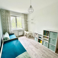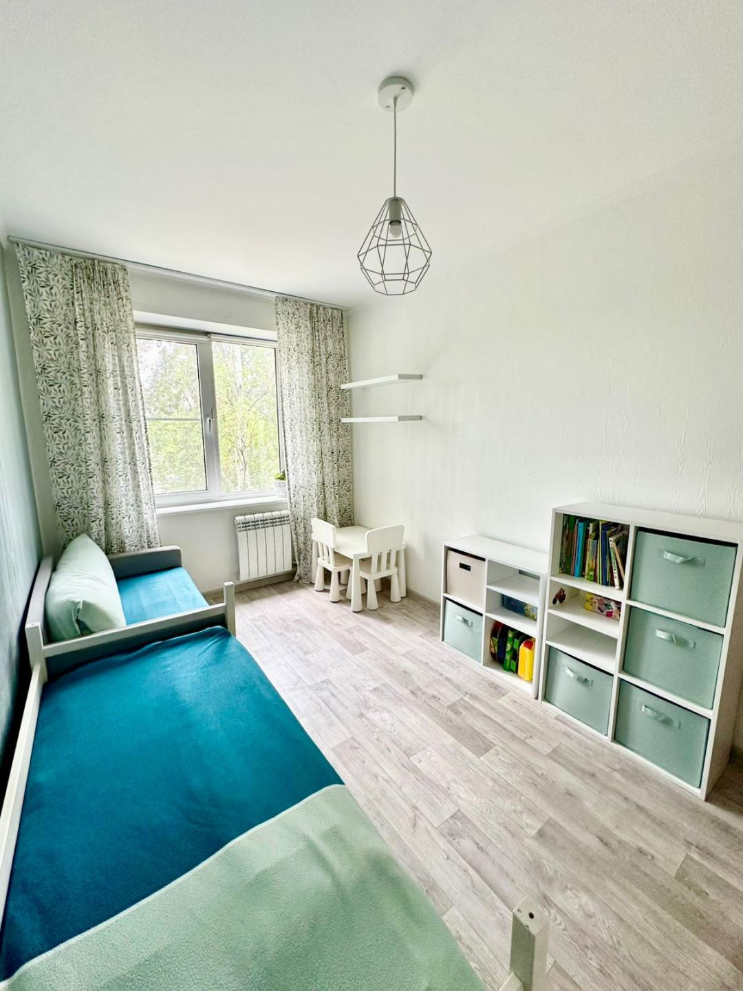 * Детская: Практичный линолеум, обои под покраску, встроенный шкаф.
