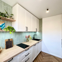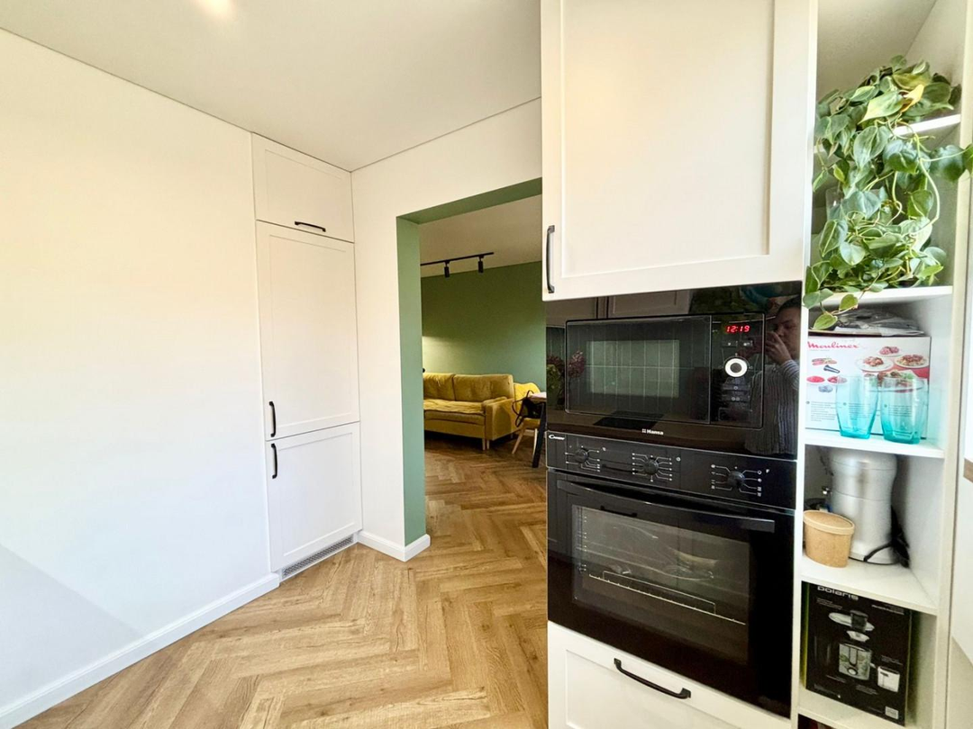 * Кухня: Кухонный гарнитур на заказ (эмаль) со встроенной техникой премиум-класса: варочная панель Hansa, духовой шкаф CANDY, СВЧ Hansa, вытяжка, холодильник Gorenje. Установлена каменная мойка, фильтр для воды AquaFort, система борт-переработки отходов. Стильный фартук из плитки, пол — кварцвинил.