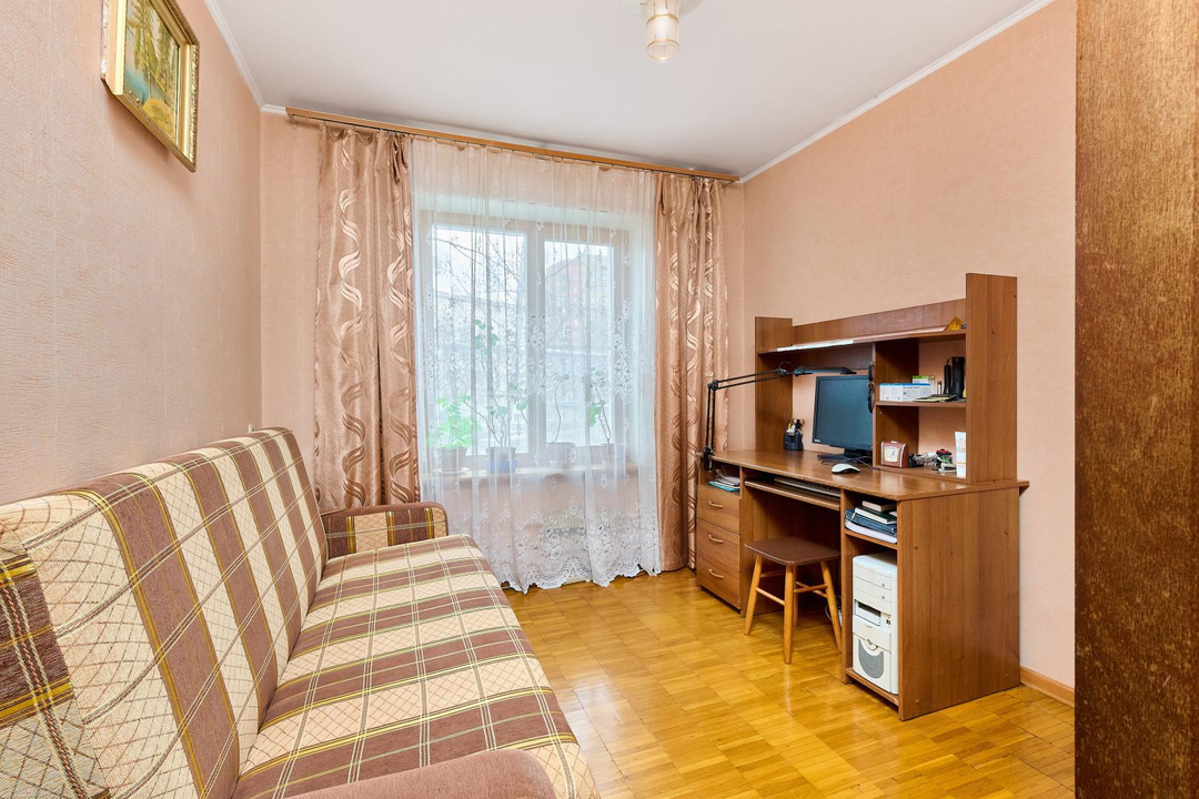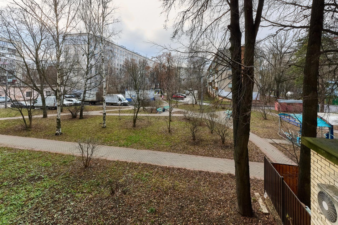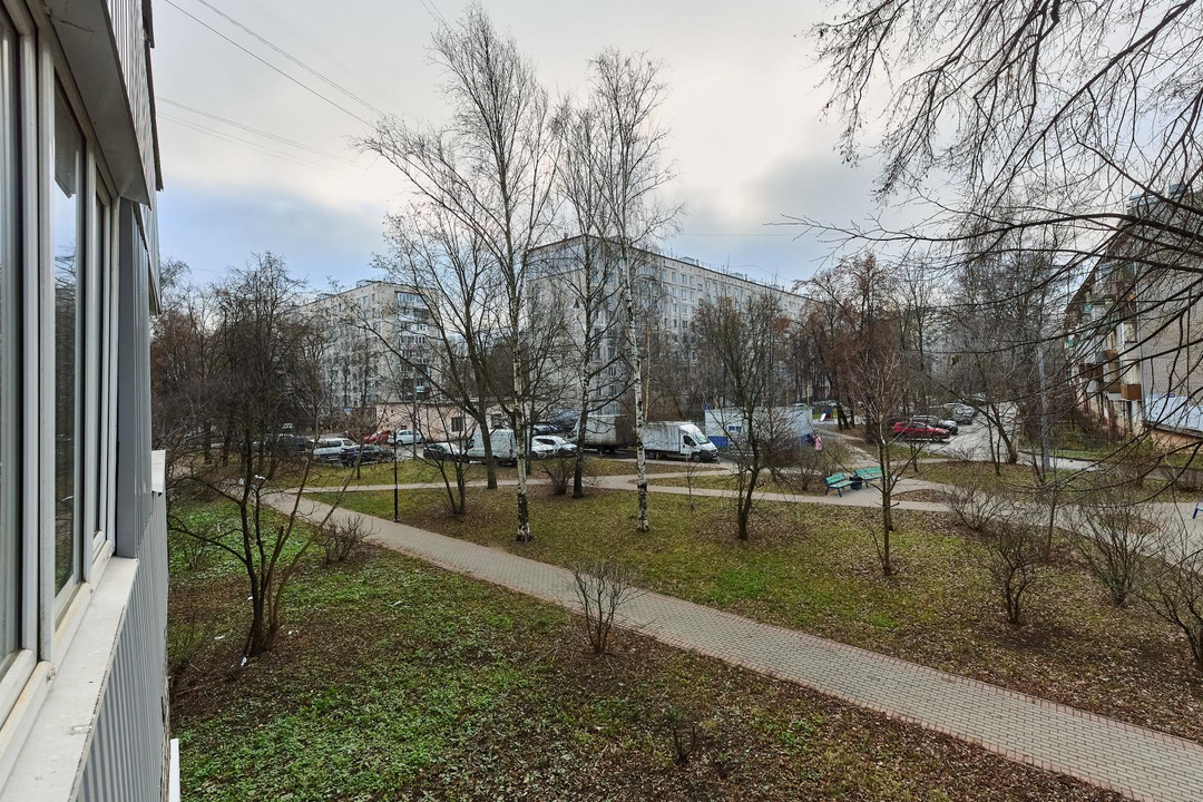 Окна выходят на 2 стороны: на зеленый сквер и во двор дома.