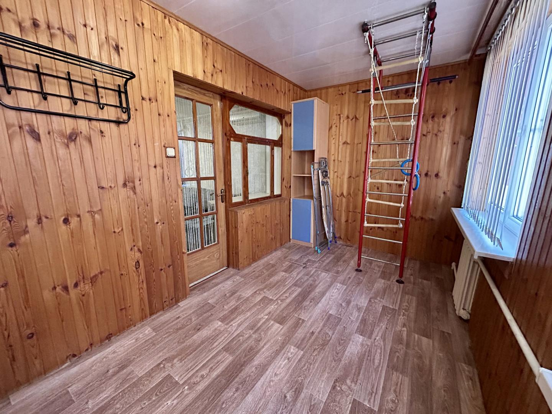 На полу плитка в санузле, ламинат в прихожей, в зале линолеум, в спальных комнатах паркетная доска.