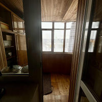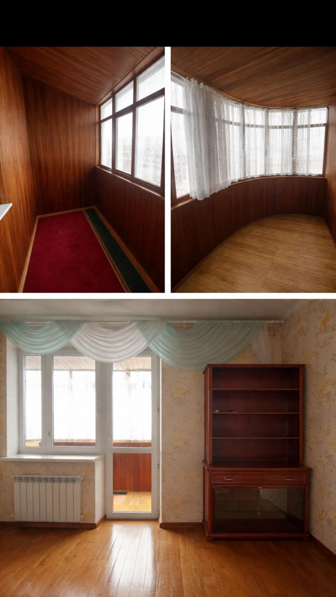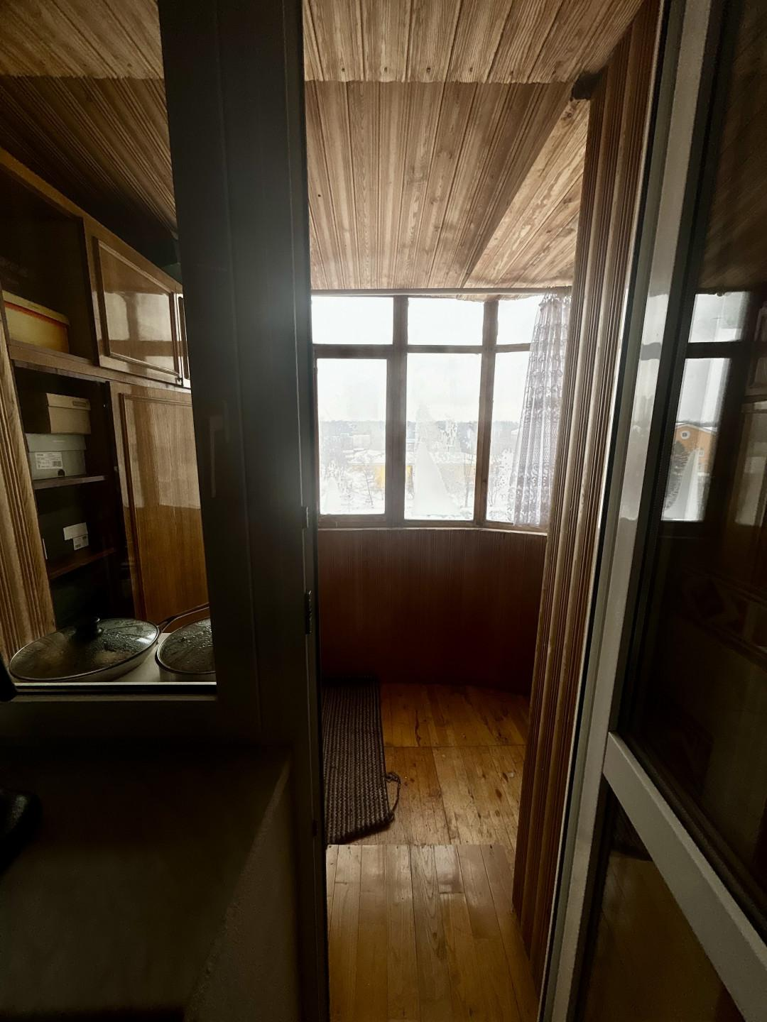 Лоджия — просторная, с деревянной отделкой и большими окнами, может использоваться как зона отдыха или мини‑кабинет.
