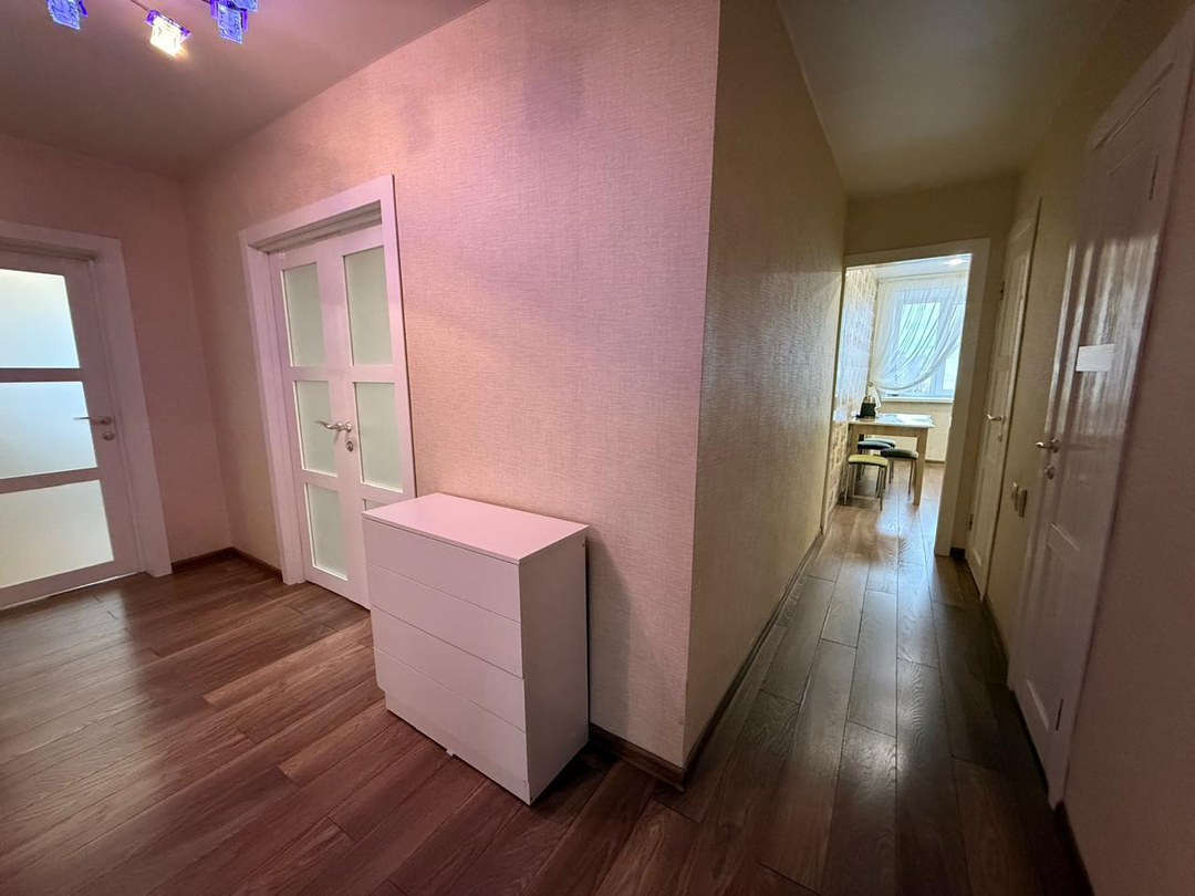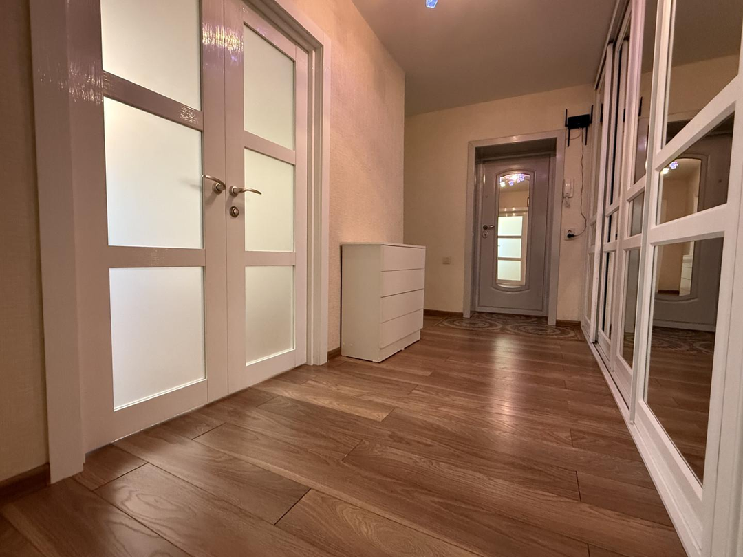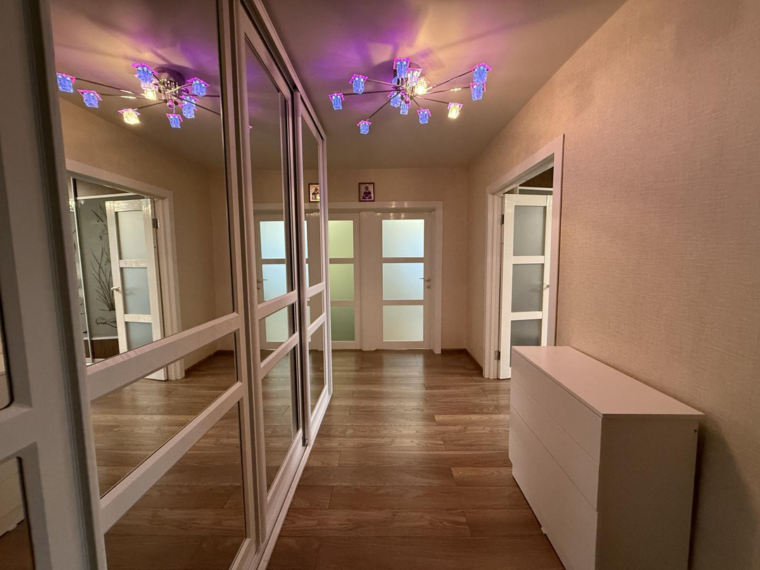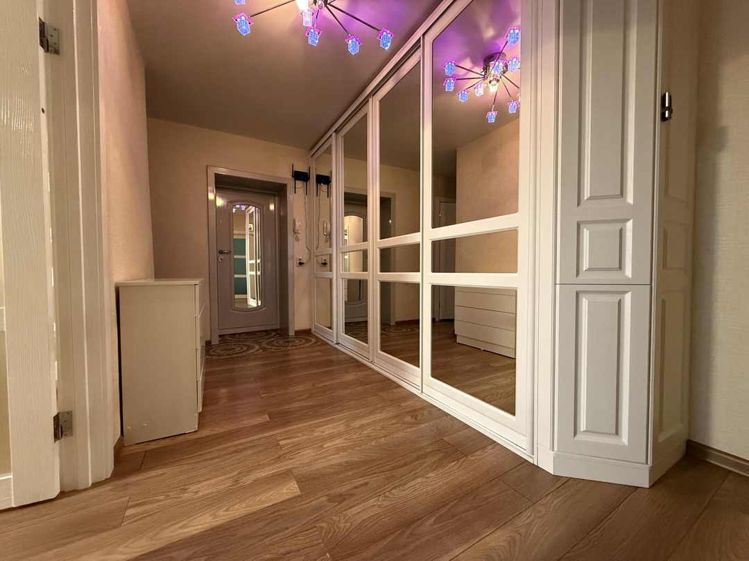 В коридоре размещен отличный вместительный зеркальный шкаф, материал шкафа, а также межкомнатных дверей покрыт специальной эмалью, что делает их использование очень удобным, комфортным и долговечным.