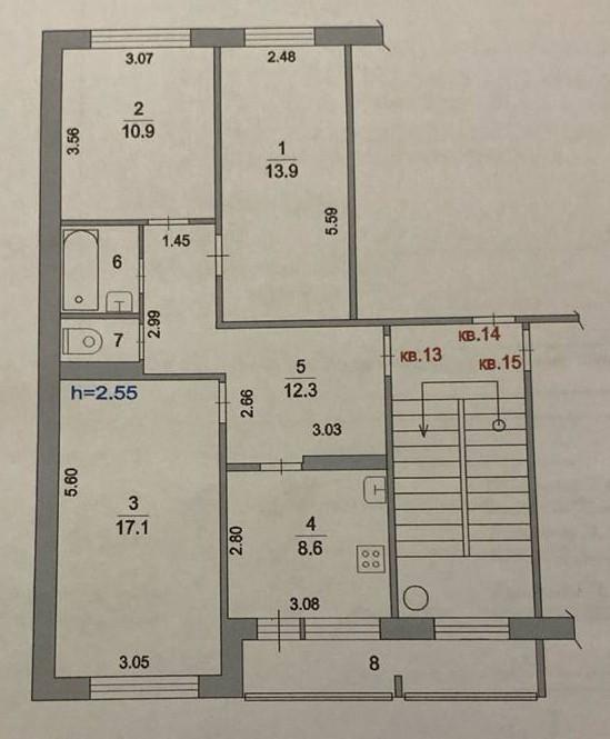 Жилая площадь квартиры составляет 69.8 кв. м. Все комнаты изолированы — 17.1, 13.9 и 10.9 кв. м соответственно, а кухня площадью 8.6 кв. м имеет выход на лоджию, что обеспечивает дополнительное удобство для семьи. Просторная прихожая в 12.3 кв. м прекрасно подходит для размещения необходимых вещей.