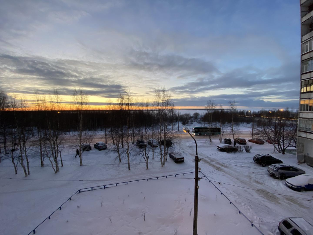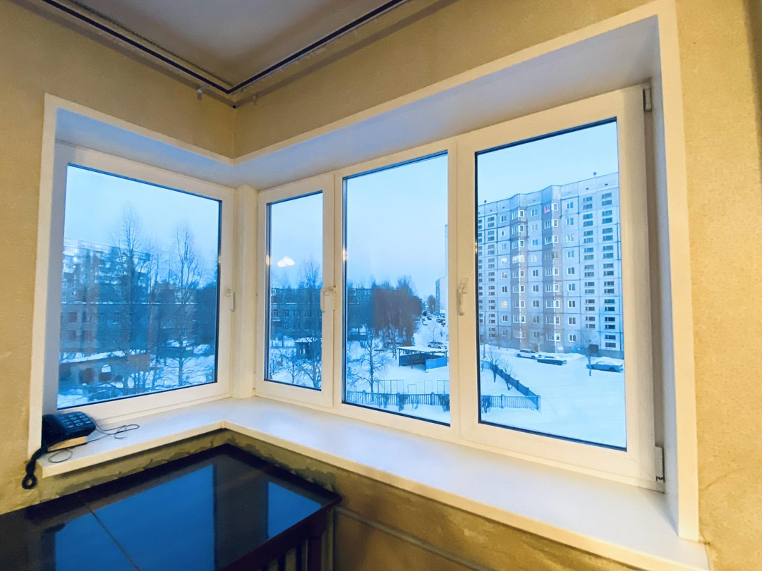 Окна на разные стороны– с видом на детский сад с одной стороны , и на залив с другой.