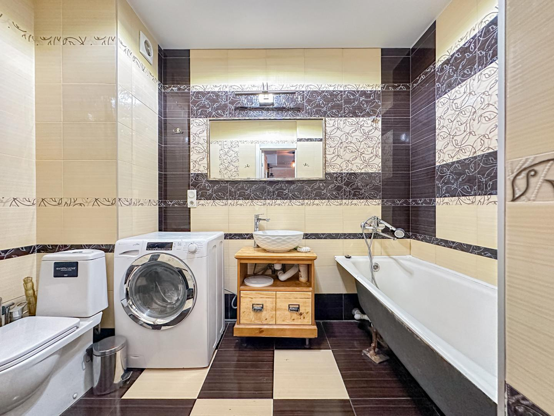 - санузел совмещенный, в плитке, новая ванная, раковина, стиральная машина,