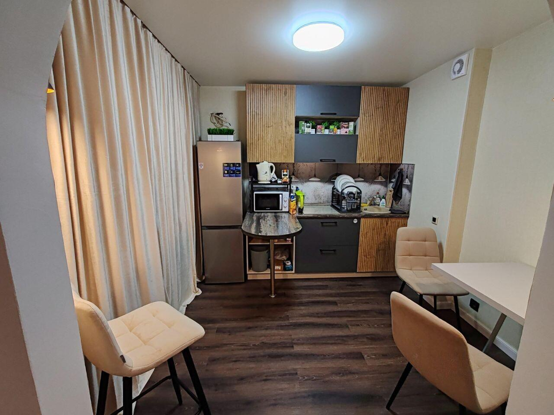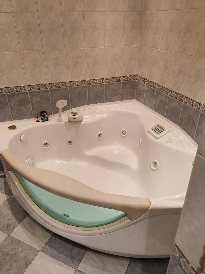 Функциональная кухня оборудована барной стойкой, индукционной плитой (3 конфорки), холодильником, микроволновой печью и кофемашиной (вся техника на гарантии). В ванной комнате обновлены трубопровод и часть сантехники, установлены джакузи и душевая кабина, а также новая стиральная машина (на гарантии).