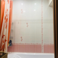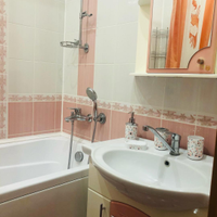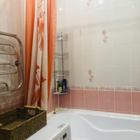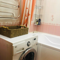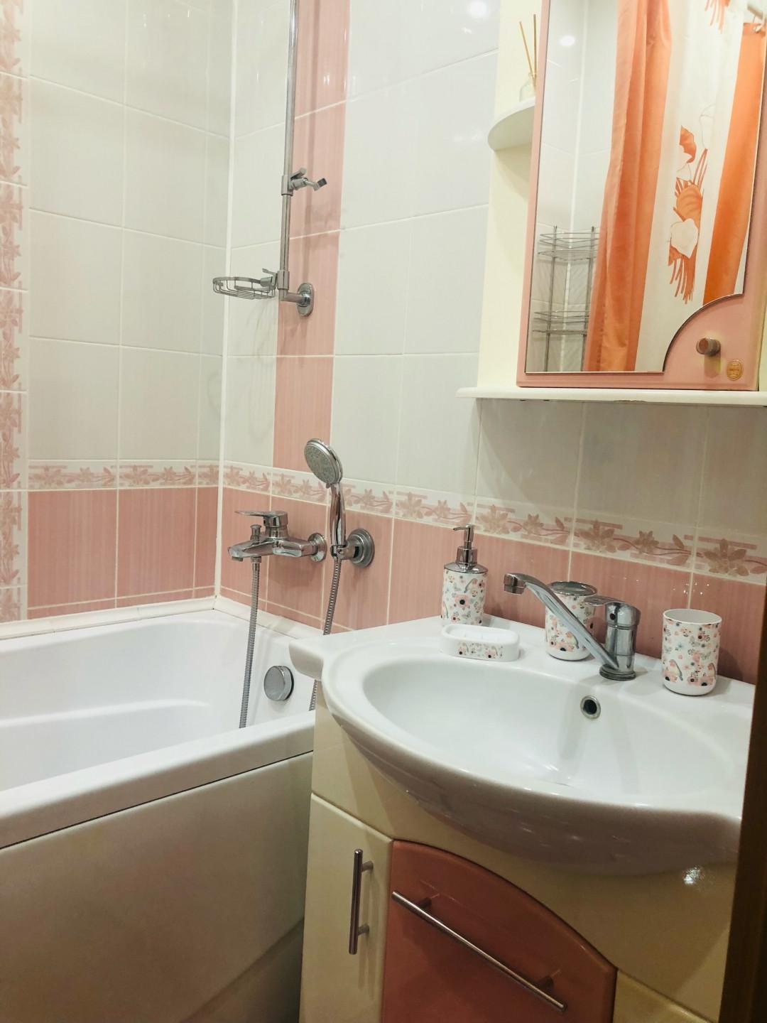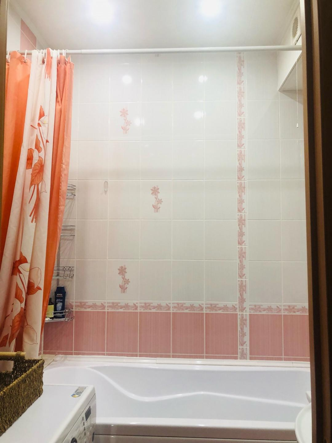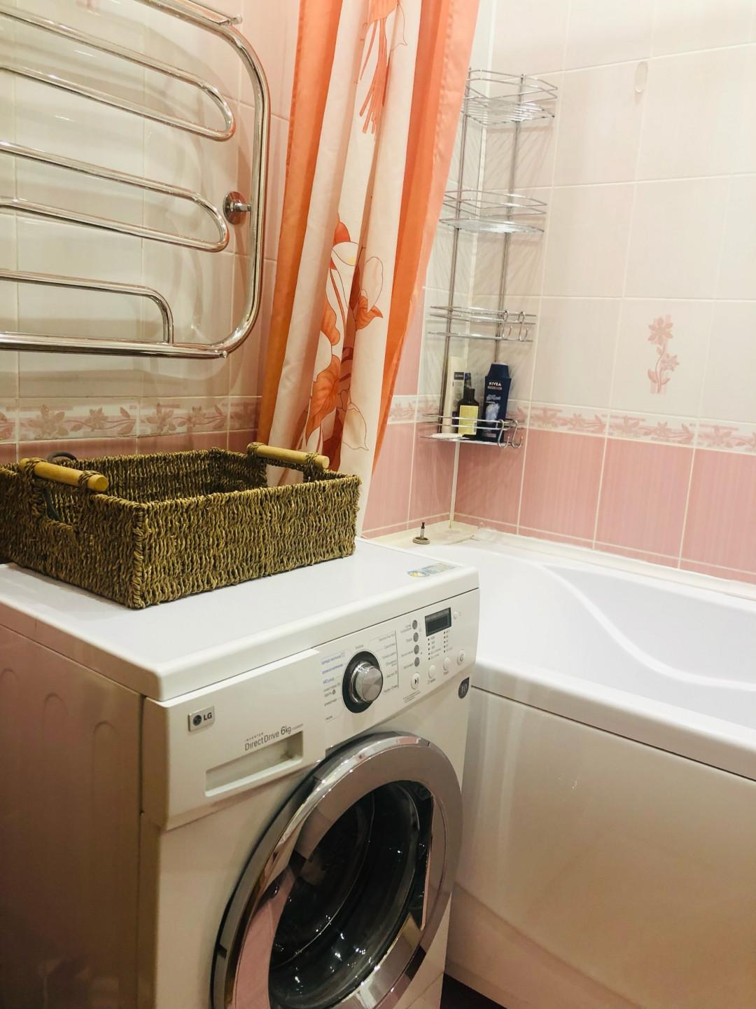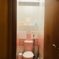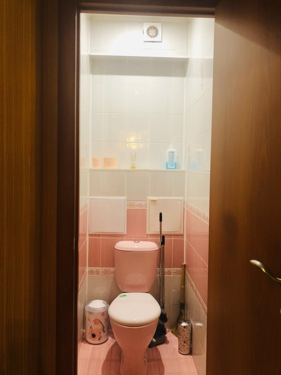 Санузел раздельный, облицован кафелем зефирно-кораллового цвета. Установлена стиральная машина, тумба с раковиной, зеркальный шкафчик.