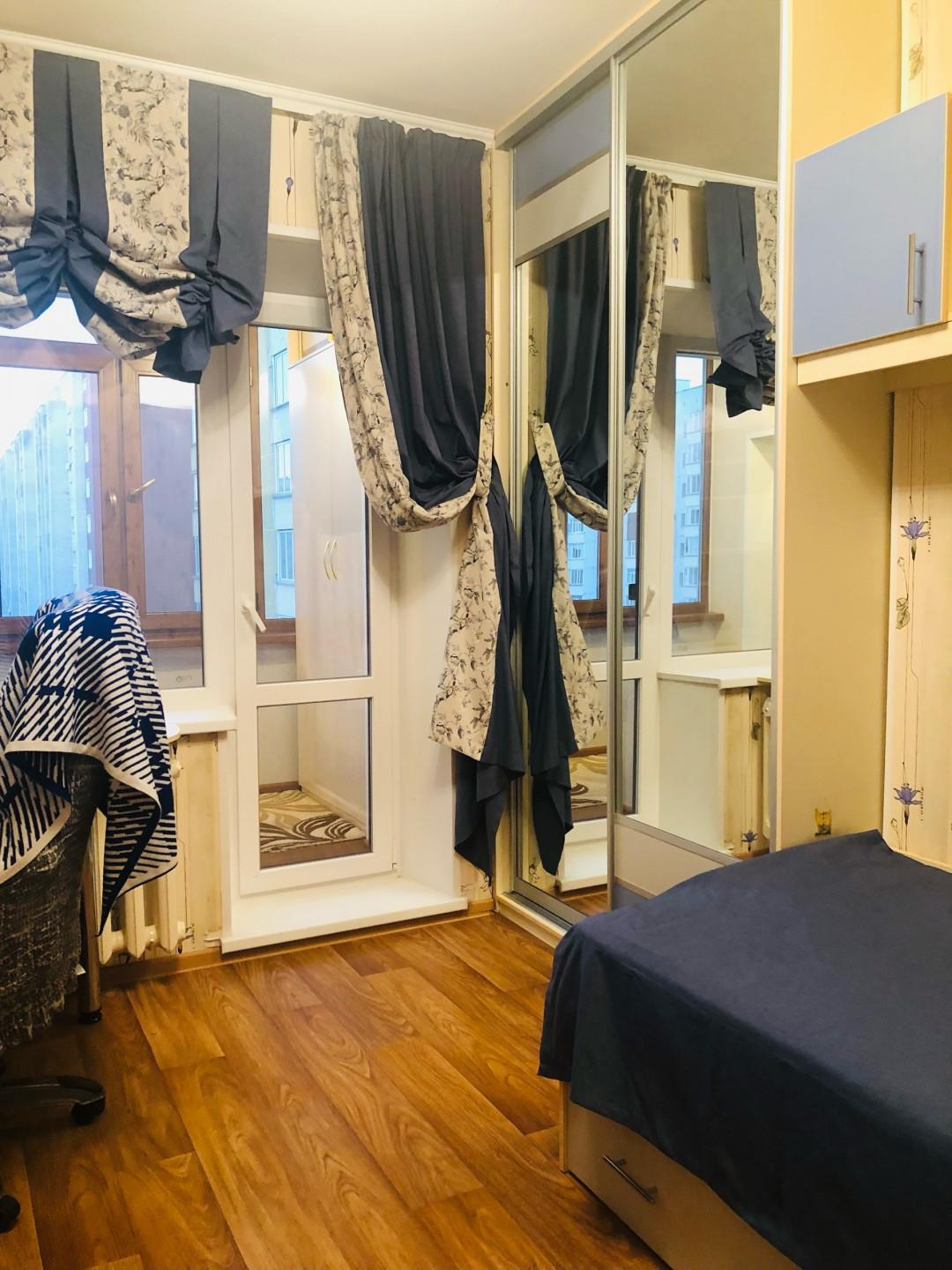 Детская комната (10,7 кв.м.) с выходом на лоджию. Гармонично разместились письменный стол, кровать, зеркальный шкаф и ящики.
