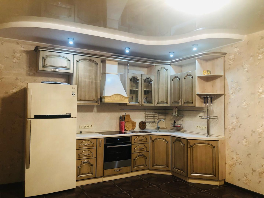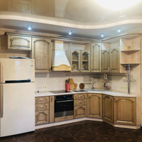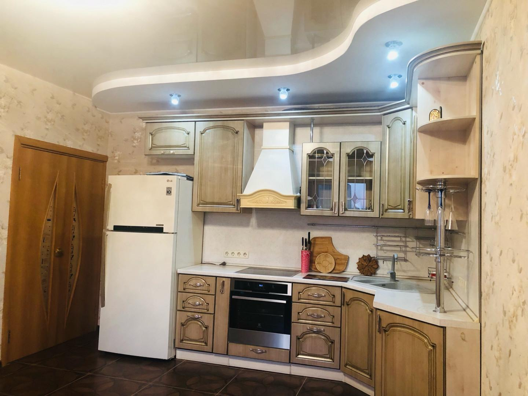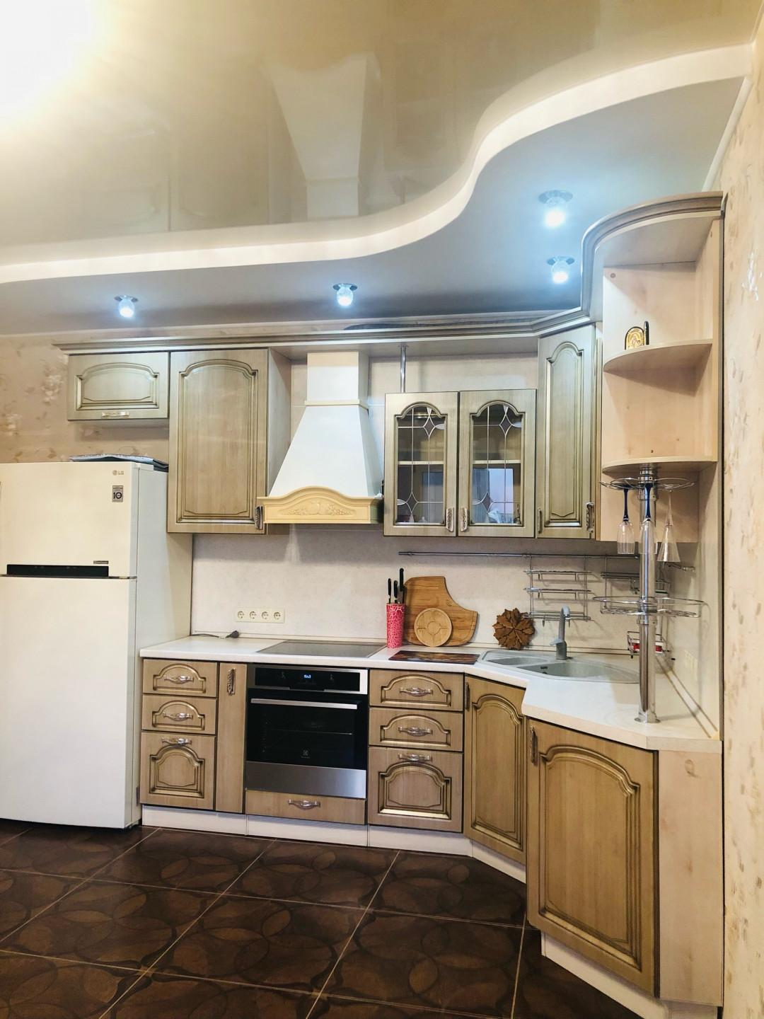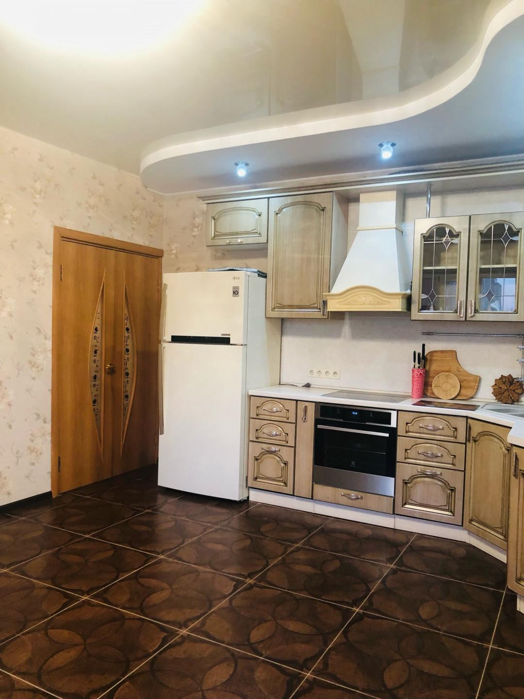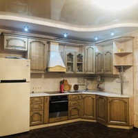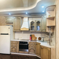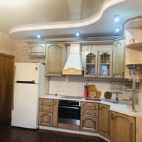 Кухня-гостиная очень просторная - 18,4 кв.м.! Установлен очень эргономичный гарнитур цвета светлого ореха со встроенной техникой - просто рай для хозяйки! Идеально разместится обеденный стол со стульями для уютных семейных обедов и званных ужинов! И уютный диван с ТВ в зоне отдыха.