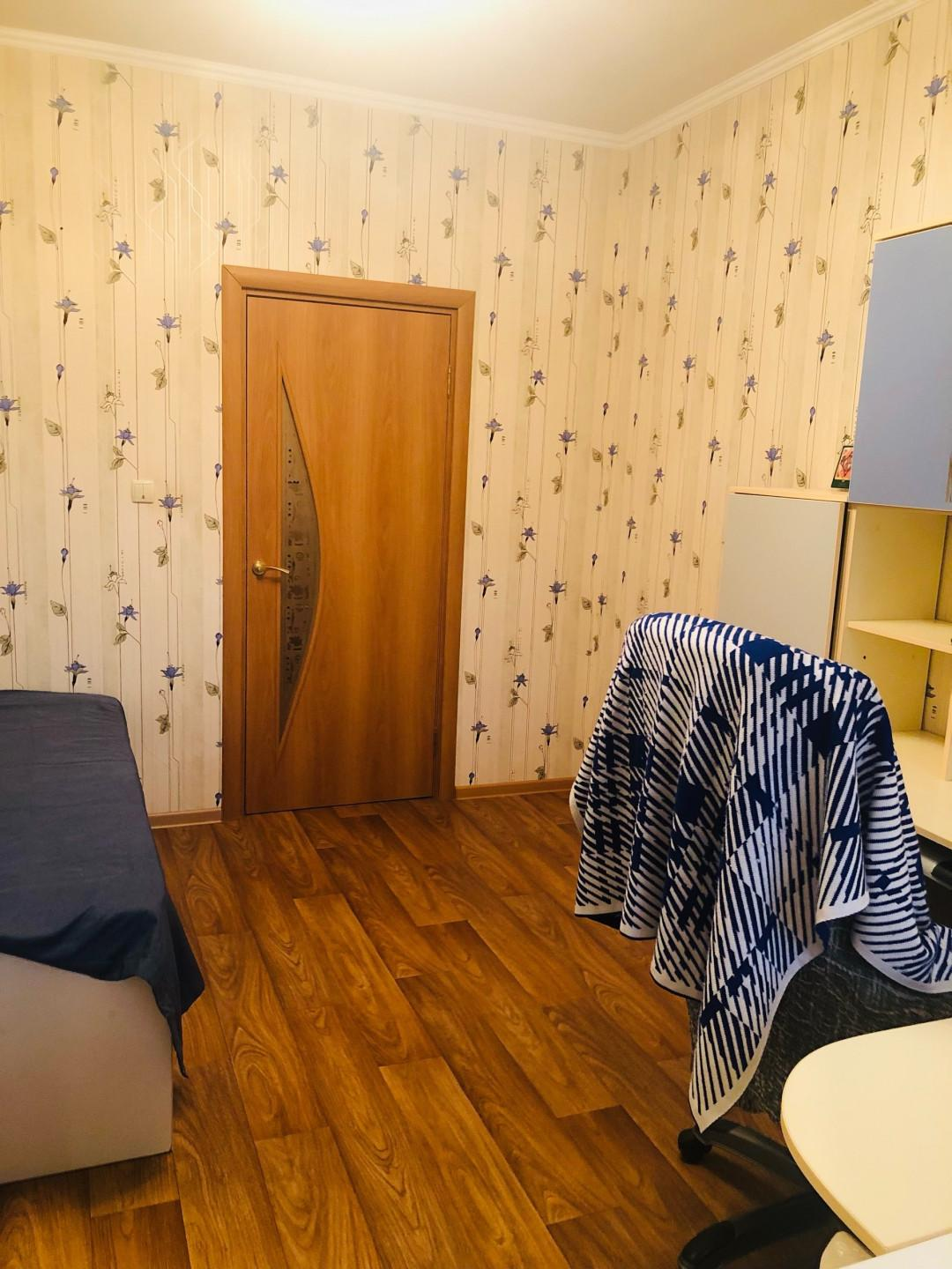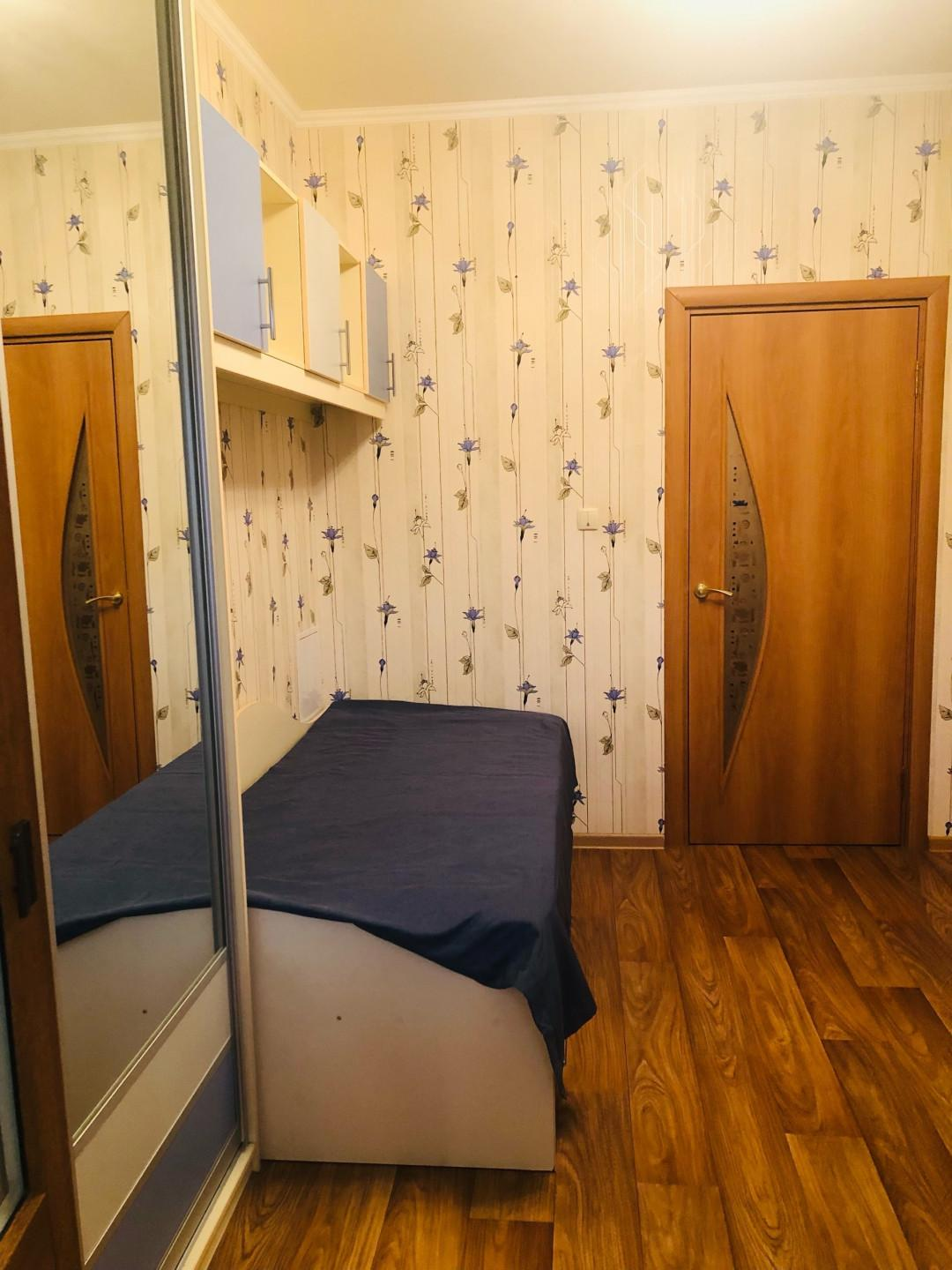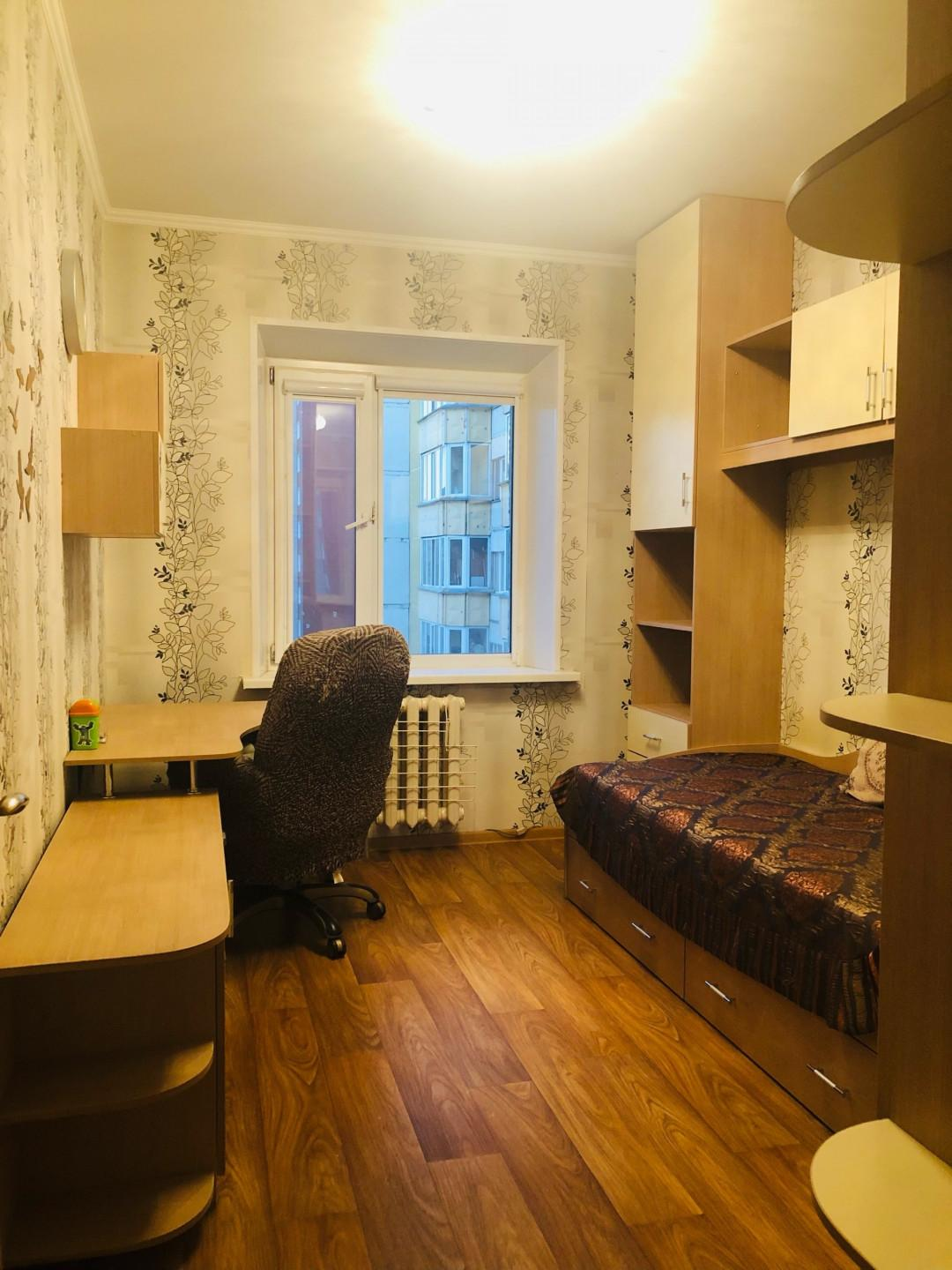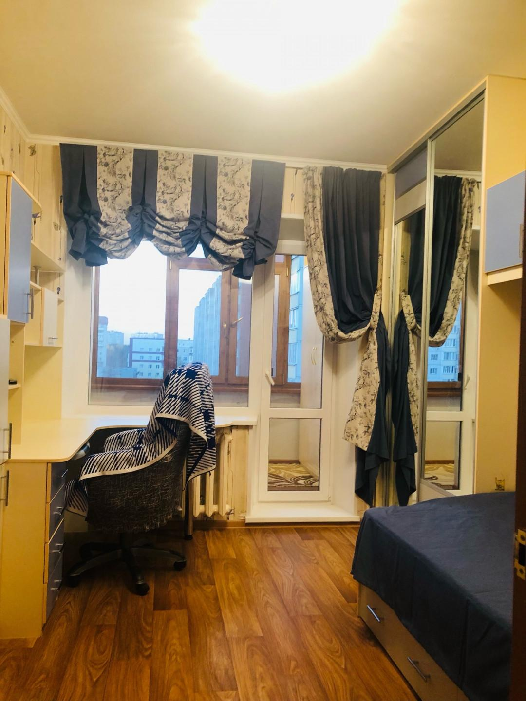 Третья комната (11,0 кв.м.) вместила в себя письменный стол, кровать, зеркальный шкаф и ящики. Люстра с вариациями освещения.