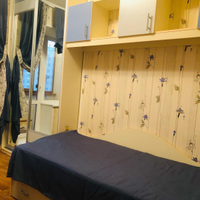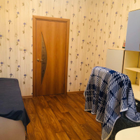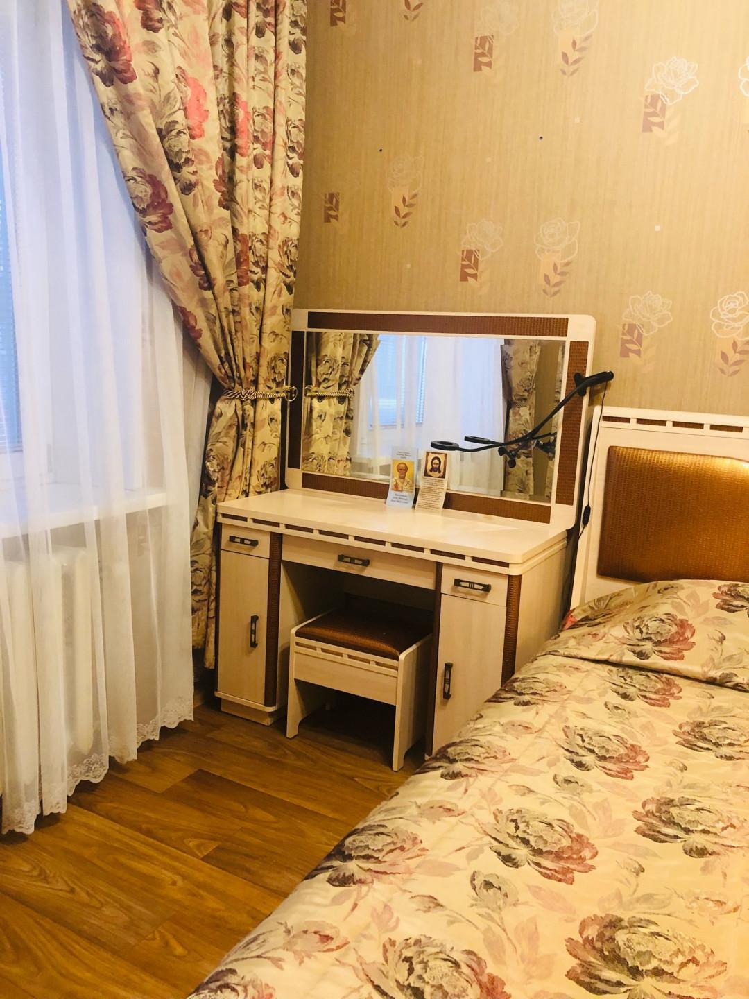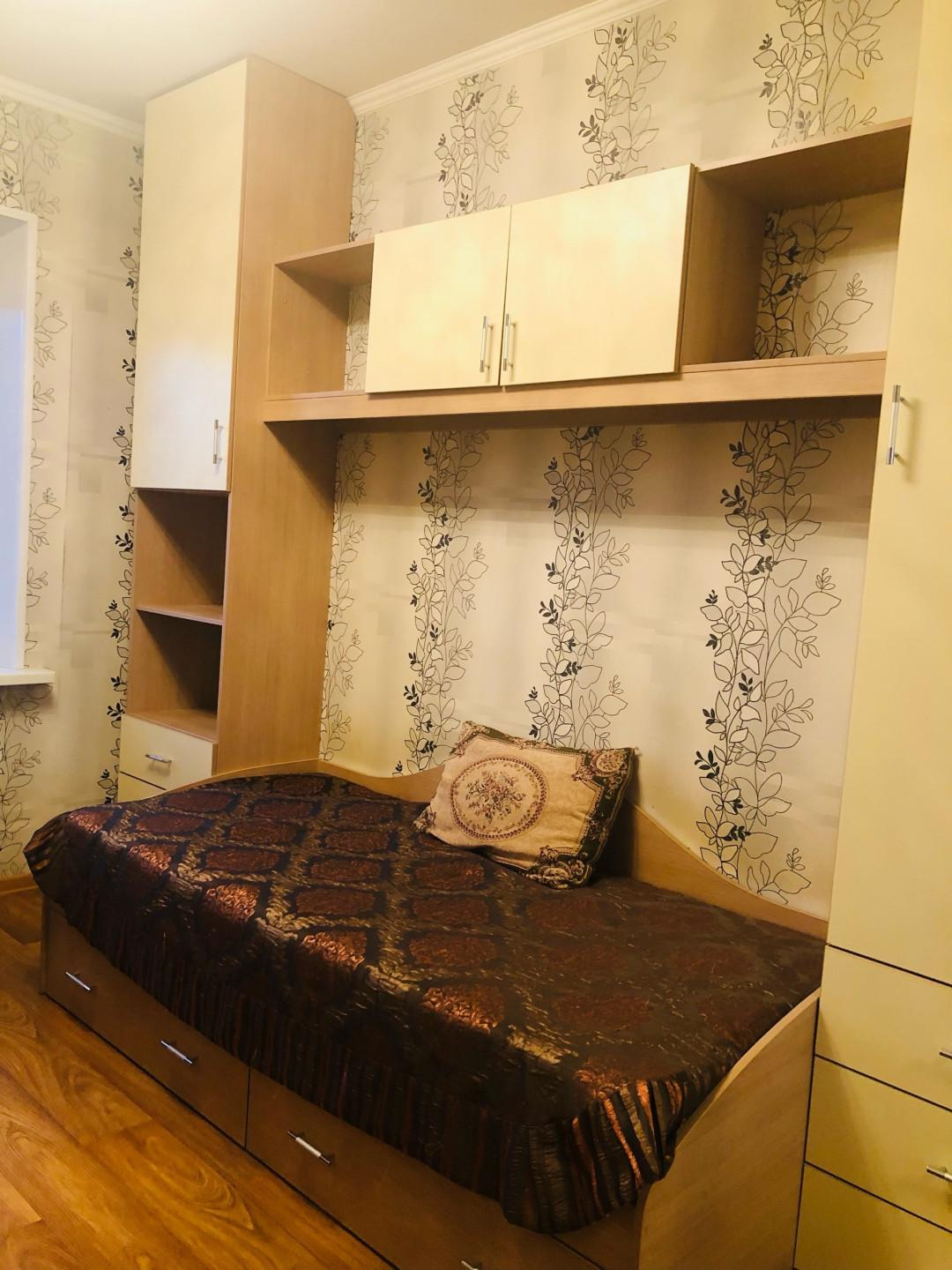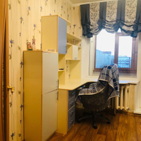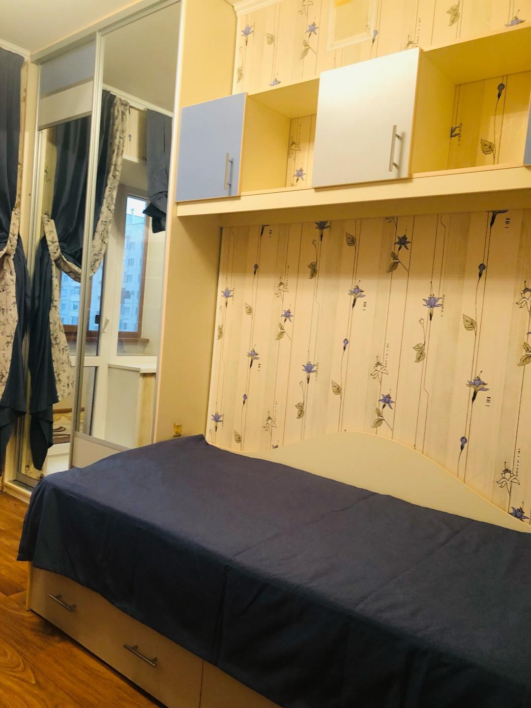 Третья комната (11,0 кв.м.) вместила в себя письменный стол, кровать, зеркальный шкаф и ящики. Люстра с вариациями освещения.