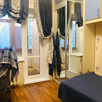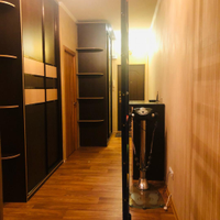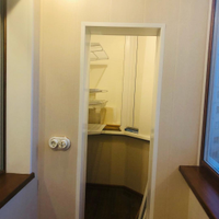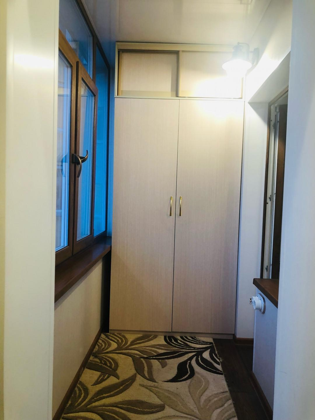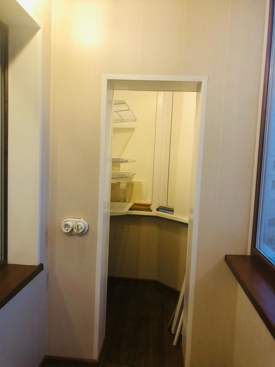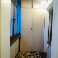 Лоджия: установлен тройной стеклопакет с ламинацией под дерево, эффект светоотражения, фурнитура "под золото". Теплый пол, освещение. Установлен вместительный шкаф.