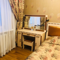 Спальня (11,3 кв.м.) влюбляет в себя с первого взгляда! Золото и алые переливы в текстиле очаровывают и придают шарм всей комнате. Уютно разместились двуспальная кровать, зеркальное трюмо, зеркальный шкаф, тумба.