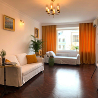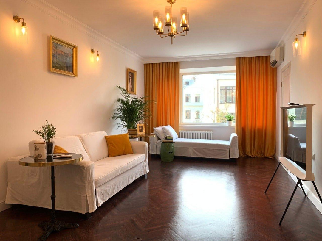 Квартира расположена в одной из самых престижных и очаровательных локаций Москвы — в тихом переулке между оживленными Тверской и Арбатом.